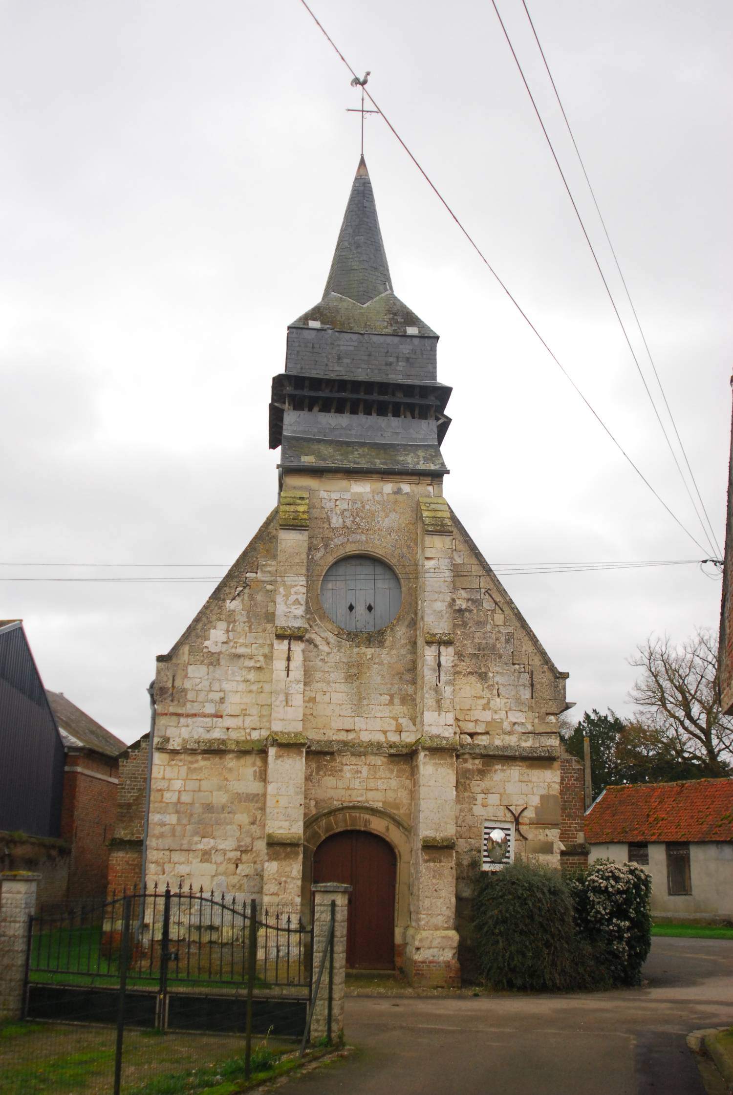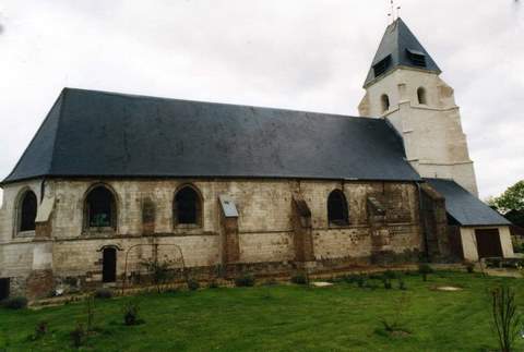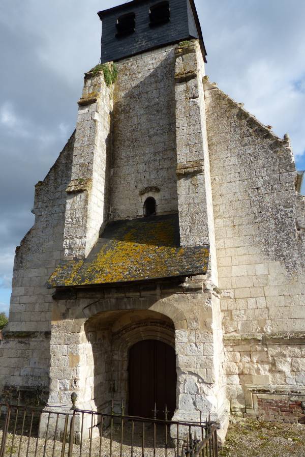 La nef rectangulaire de l’église comporte des fenêtres cintrées qui permettent de la dater du xvie s., tandis que l’abside polygonale porte la date de 1781 qui correspond vraisemblablement à la construction de cette partie de l’édifice. Les murs sont appareillés en calcaire local et surmontés d’une haute toiture en ardoise. Ils sont renforcés par de solides contreforts en brique, rendus nécessaires par les poussées de la charpente. La façade ouest comporte une porte cintrée encadrée de deux robustes contreforts en pierre appareillée. La porte principale est cernée d’une moulure d’esprit gothique, au-dessous d’un oculus. Elle est surmontée par le clocher en charpente, recouvert d’ardoises. Des ancres métalliques viennent solidariser cette façade avec la charpente et corrigent des désordres anciens. Aucune fissure n’est apparente sur les murs qui semblent stabilisés.