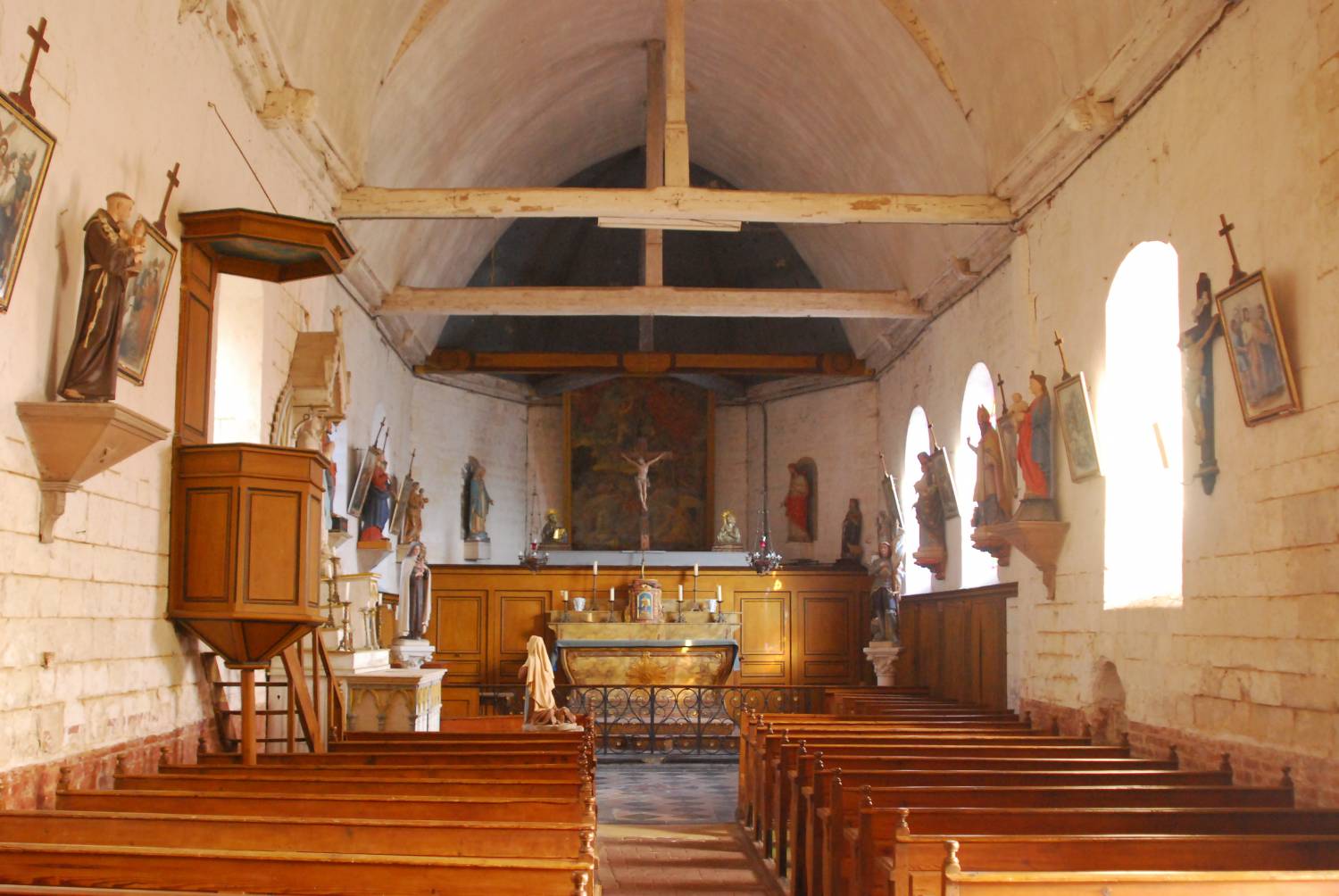 L’intérieur est couvert d’une voûte en bois ornée de blochets figurant des têtes humaines. Le mobilier comporte des bancs en chêne du début du xixe siècle. Plusieurs statues en bois polychrome du xvie s. sont inscrites sur l’inventaire des monuments historiques : un Christ en croix, la Vierge à l’Enfant et saint Nicolas. Un vitrail du xixe s. représente saint Nicolas.