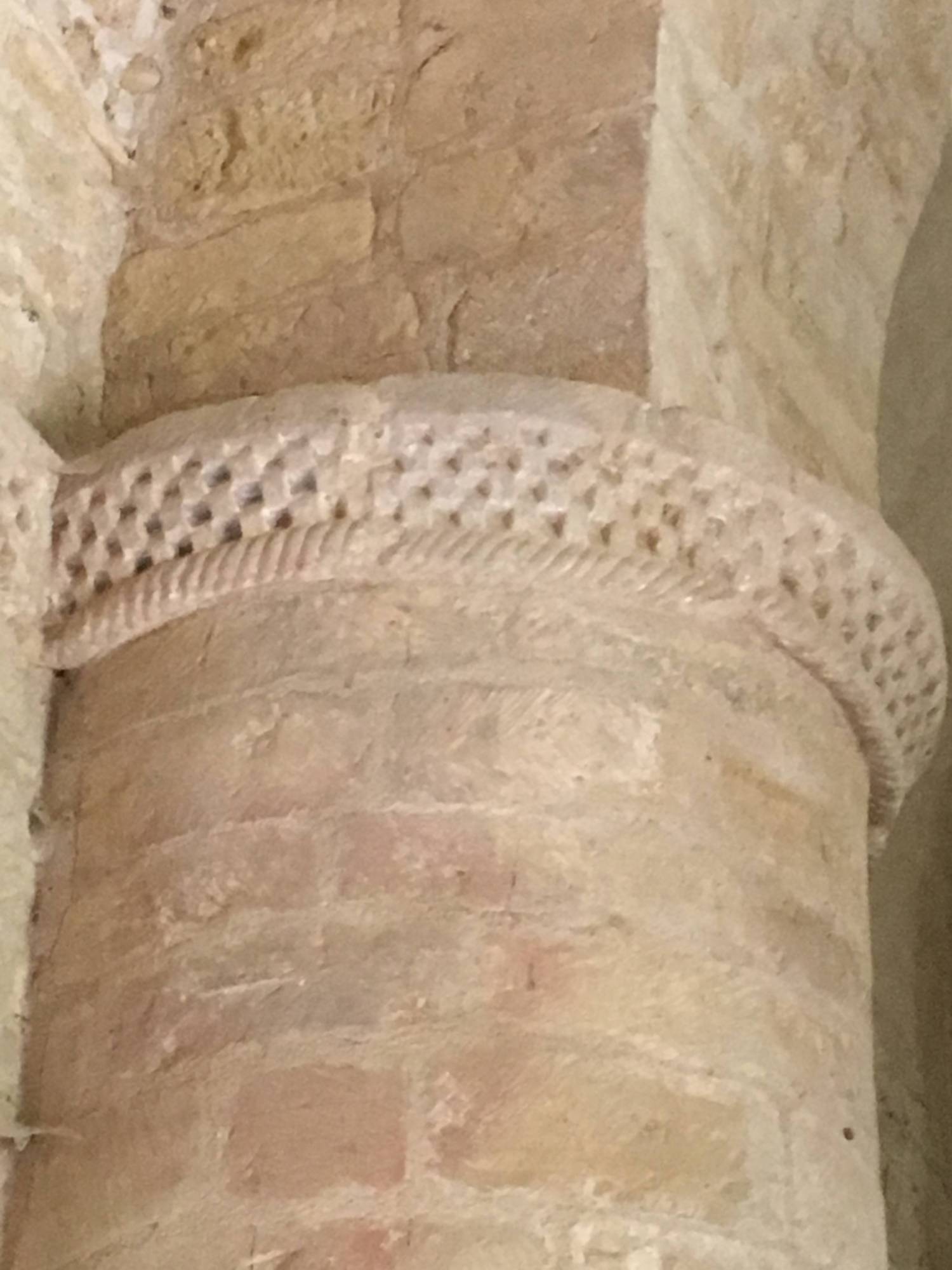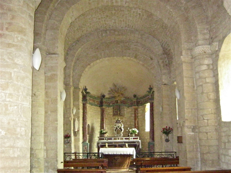 L’édifice est composé d’une nef unique de 3 travées, suivie d’un choeur avec une abside semi-circulaire voûtée en cul de four. Les différentes travées sont séparées les unes des autres par des colonnes engagées par le quart (1ère et 2e travées) ou par des piliers rectangulaires aux impostes sculptées supportant des arcs doubleaux de section rectangulaire, rythmant la voûte en berceau à l’origine en plein cintre.