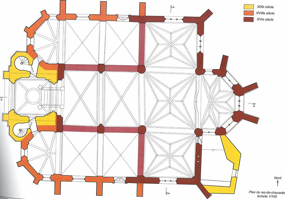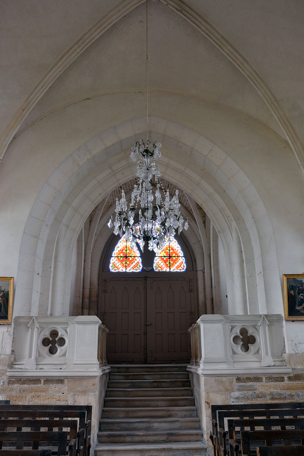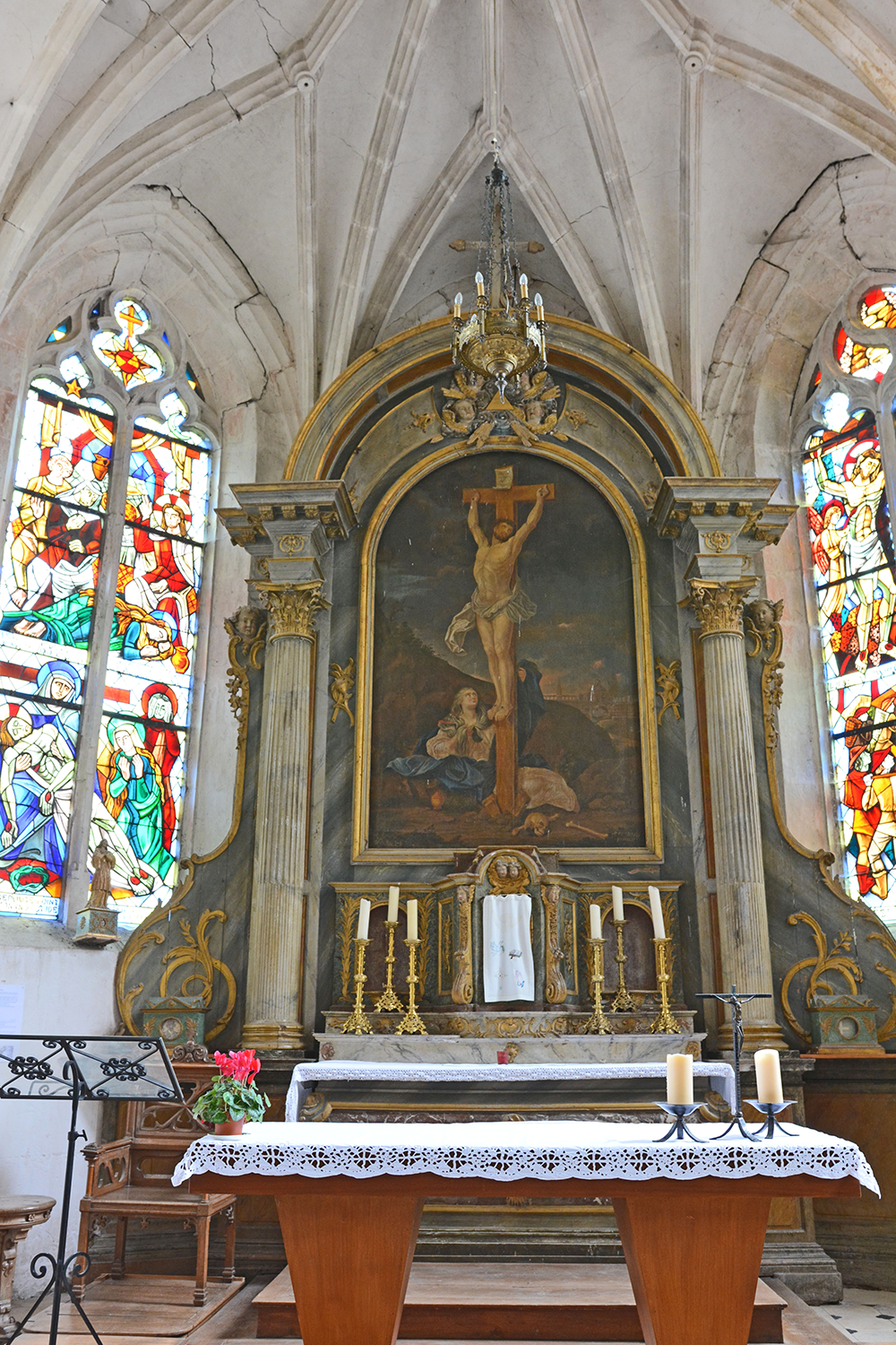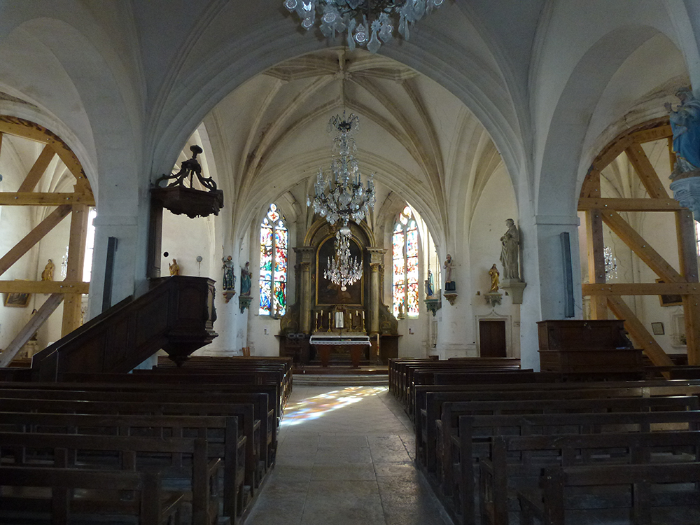 Edifice construit au XVIème siècle en forme de croix latine, orienté. Le choeur de style gothique flamboyant est à 5 pans. La nef qui comprend trois travées est également de style gothique, ainsi que les bras Sud du transept. Le bras Nord réalisé plein cintre est de construction plus tardive. Les voûtes du choeur sont à six branches d’ogives, liernes et tiercerons. Celles du transept sont du même style mais à quatre branches. Quelques clefs de voûte sont sculptées alors que celles du choeur et du bras Sud restent en attente. La nef est longue de 17m et la largeur du transept est de 20m, la hauteur sous voûte est de 7m.
