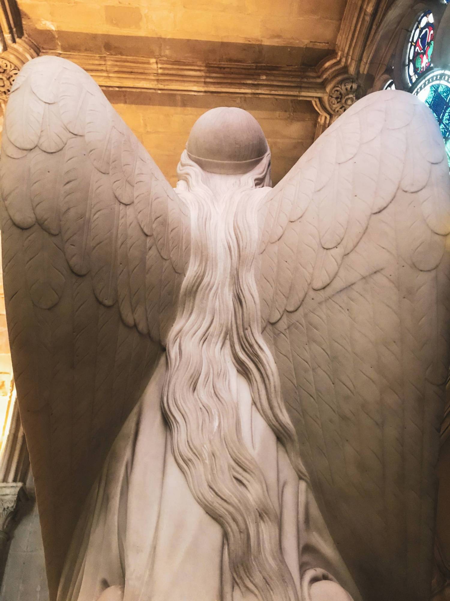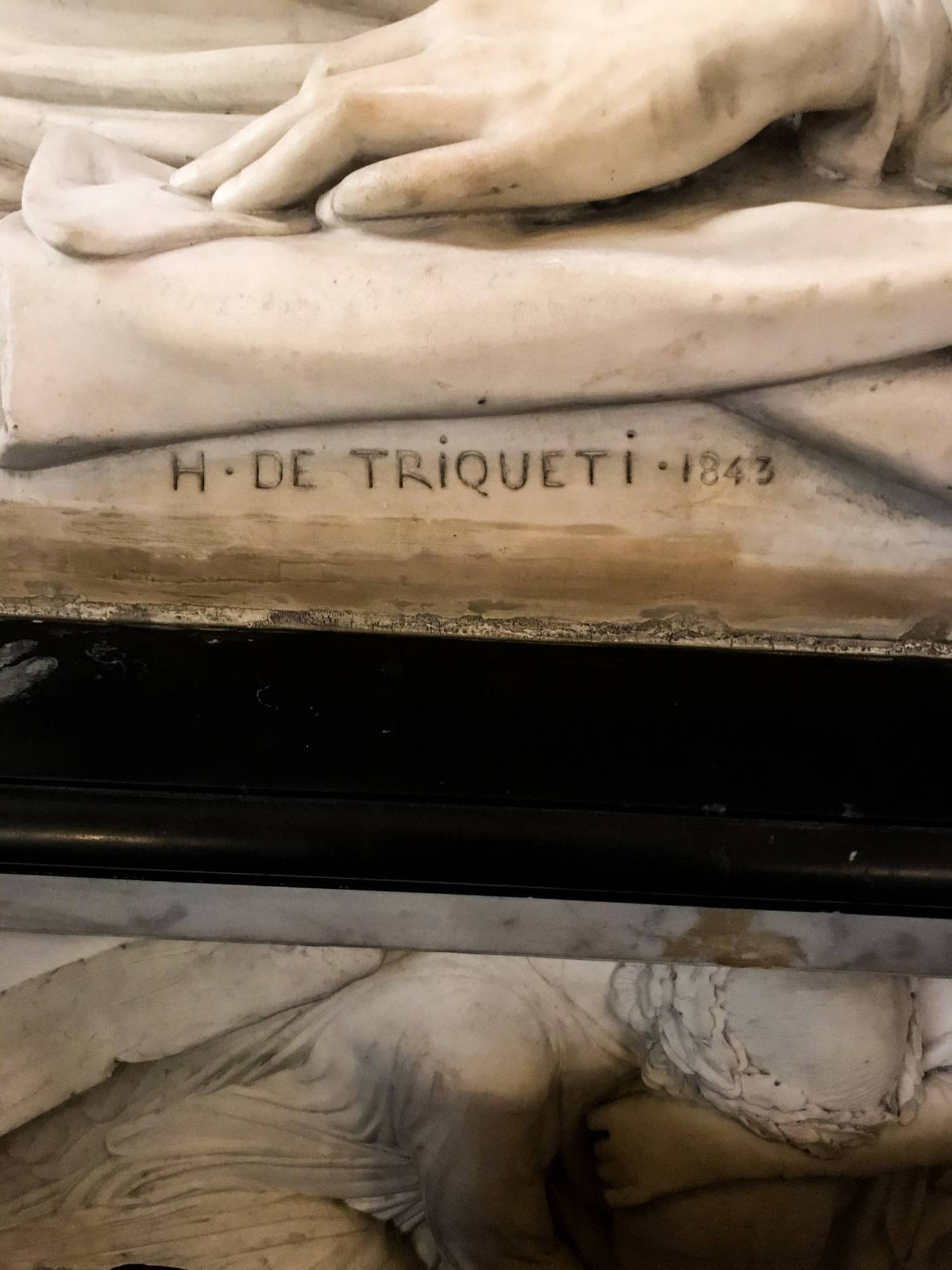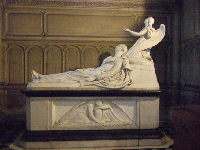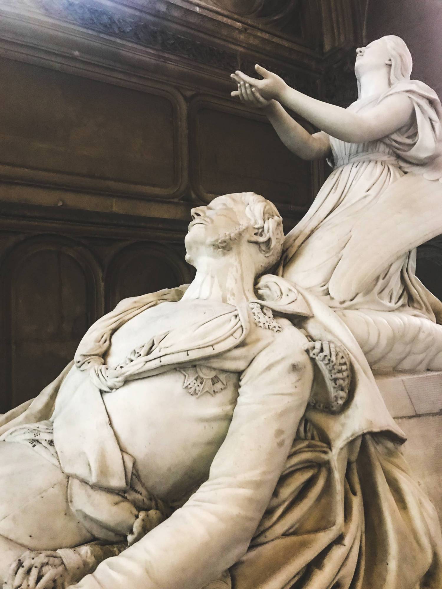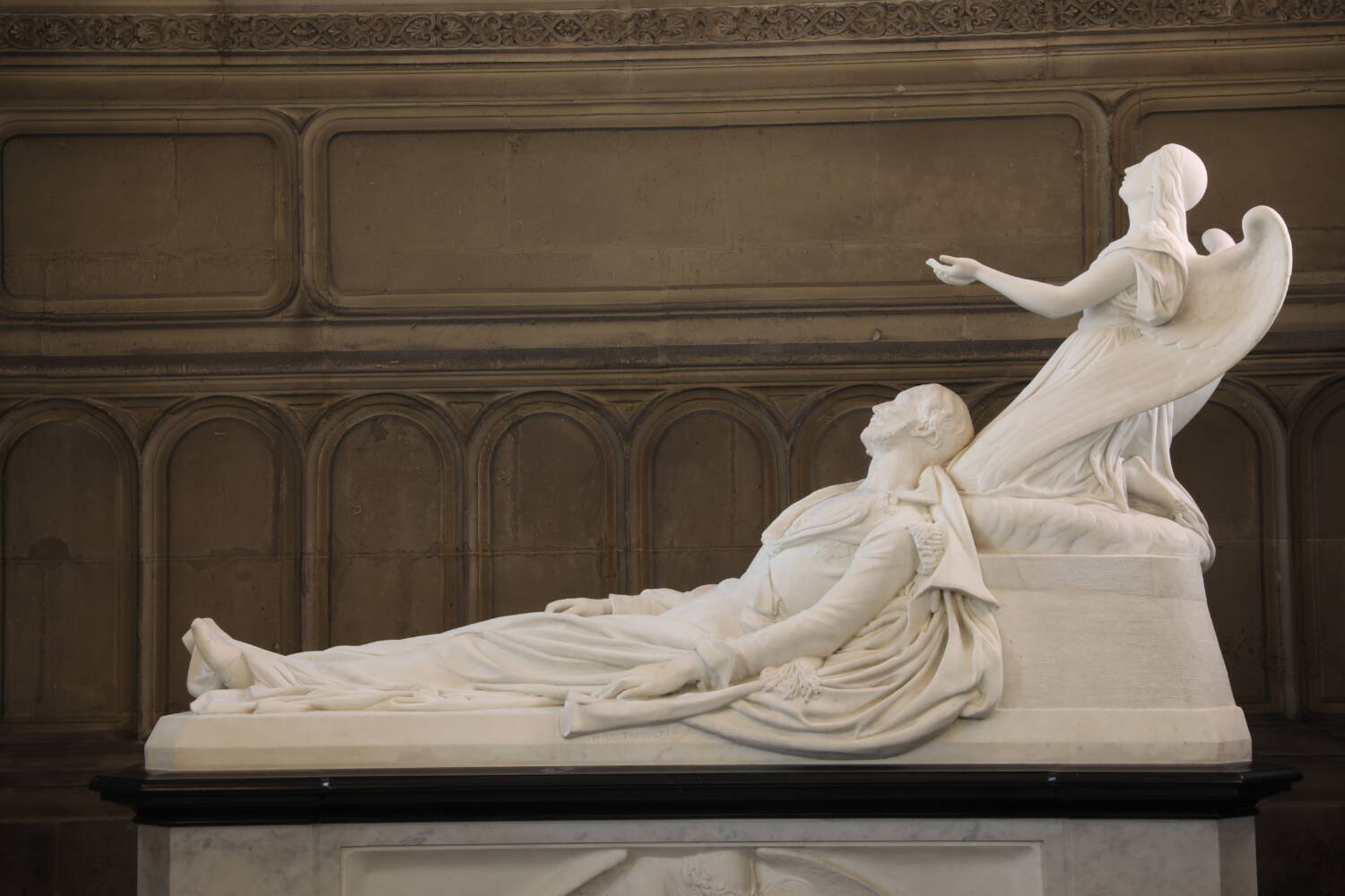 La maquette à grandeur d’exécution conservée au Musée Girodet de Montargis et l’œuvre finale soulignent bien que Triqueti et Scheffer privilégient la sobriété du monument, en donnant au prince la position d’un homme en train de mourir, le torse découvert et la bouche entrouverte. Les traits du visage sont fidèles à ceux du prince, que l’on connaît par le très beau portrait d’Ingres (1842, huile sur toile, musée du Louvre). La composition frappe le visiteur tandis que la douleur des anges vient faire écho à celle de la famille. Comme l’écrivait Sylvain Bellanger, on peut lire dans ce marbre de carrare « un chef[1]d’œuvre de la sculpture romantique ». Lors des manifestations de 1870, les vitraux et les statues sont déposés pour les protéger de tout acte malveillant. Le cénotaphe ne reviendra qu’après le déplacement de la chapelle, du boulevard Pershing à son emplacement actuel, boulevard d’Aurelle de Paladines. La chapelle, désormais de la Compassion, est classée au titre des monuments historiques par arrêté du 21 janvier 1929.