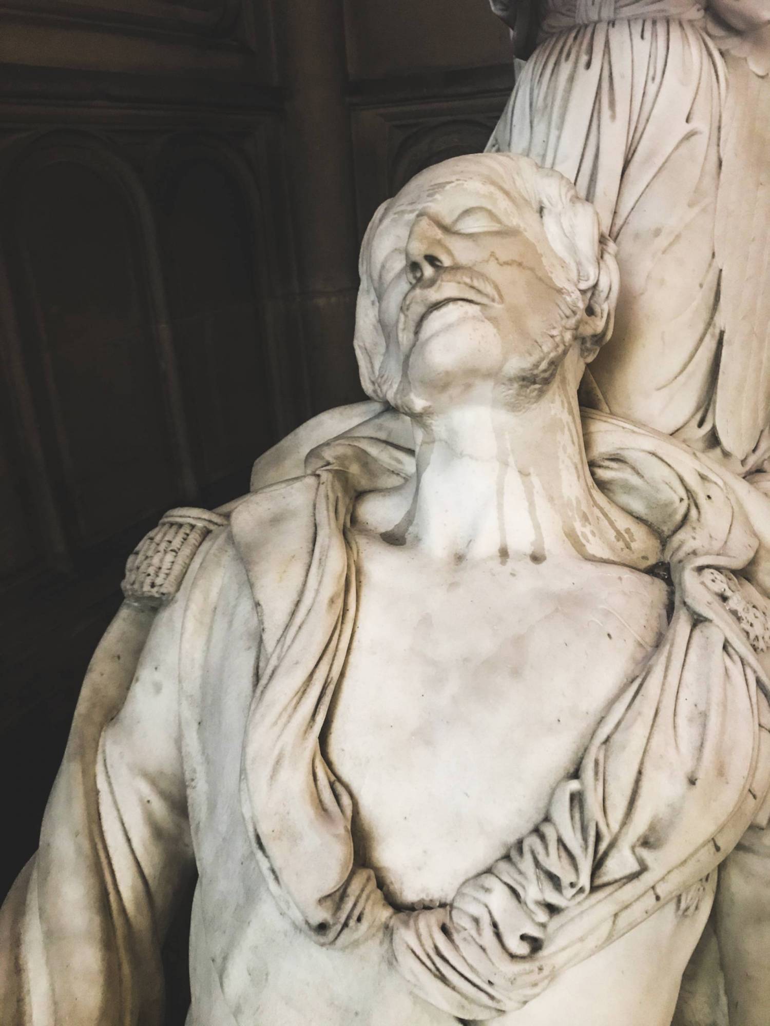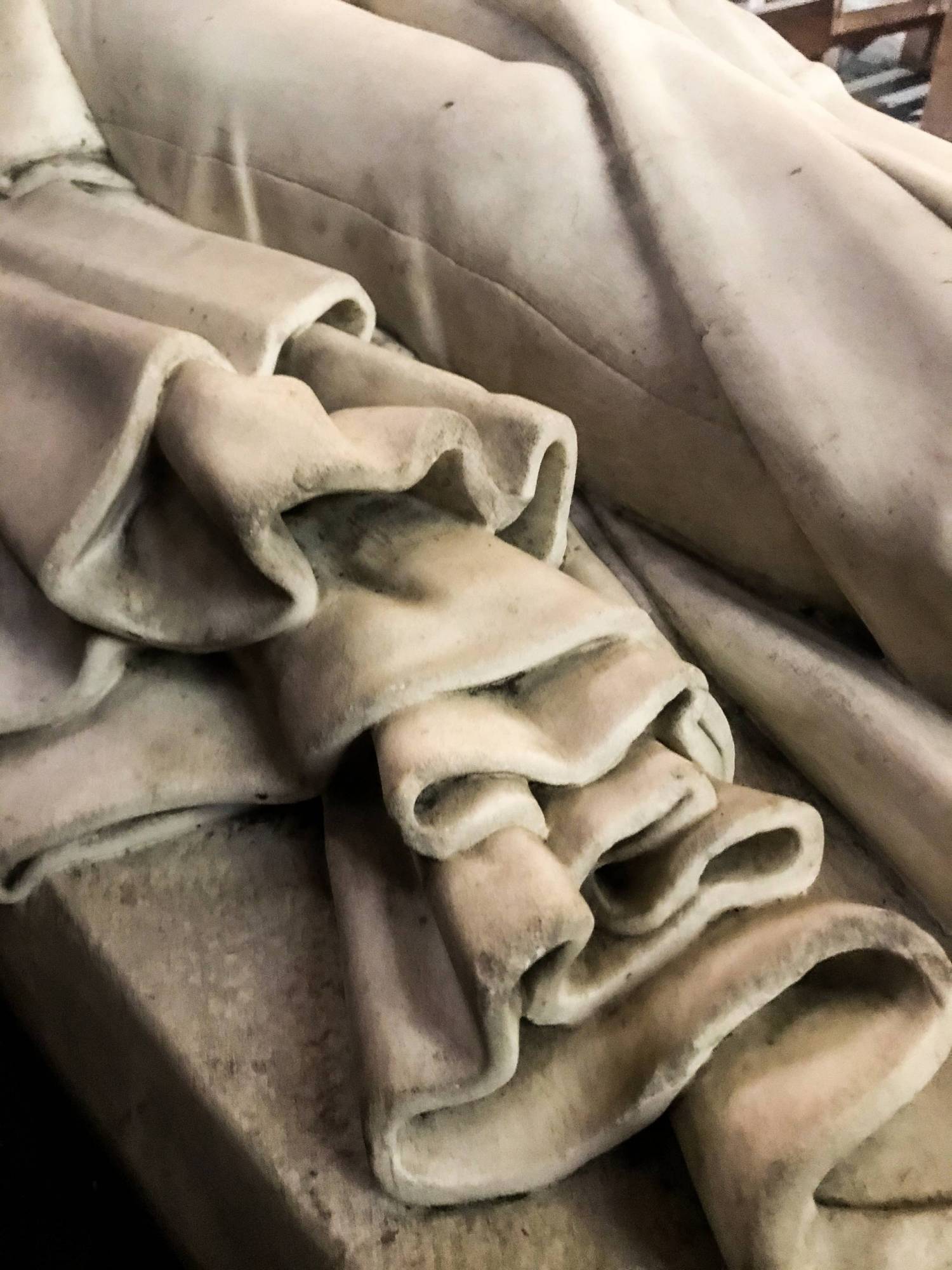 Empoussiérée et encrassée, la sculpture présentait des coulures de cire, qui, si elles réinsistaient sur le caractère tout à fait vivant de ce patrimoine, n’en étaient pas moins des témoins qui portent atteinte au cénotaphe. Quant au socle, il présentait d’anciens joints de comblement disgracieux. Sa restauration a permis de retrouver une lecture totale de cette œuvre essentielle.