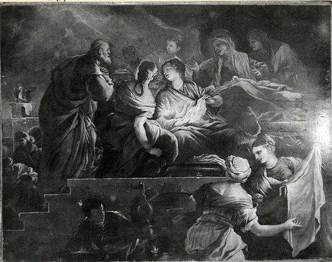 Cette très grande toile est conservée dans le transept nord de l’église. Le peintre a choisi de représenter la venue au monde de Marie. Anne, sa mère, est visible à droite du tableau, en retrait, encore alitée. Le père, Joachim, s’approche humblement vers son enfant, les bras croisés sur la poitrine. Au premier plan des domestiques s’affairent : un jeune garçon alimente le brasero pendant que deux femmes plient les linges utilisés pendant l’accouchement. Tous les protagonistes de cette douce scène semblent béats et reconnaissants d’assister à cet évènement. Le nourrisson, porté par une servante, est au centre du tableau. La scène est irradiée par la forte lumière émanant du bébé.