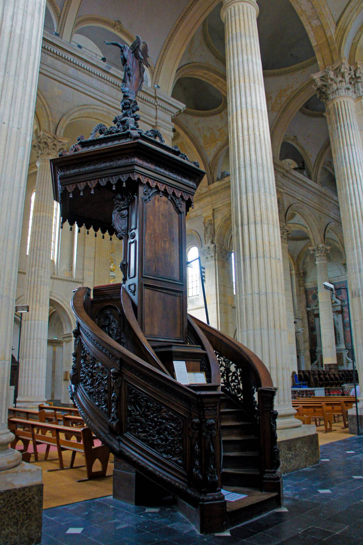 La chaire de vérité de la basilique de Boulogne-sur-Mer est une œuvre composite. Dans son état primitif, elle date du XVIIIe siècle et occupait la chapelle de l’ancien couvent des Capucins, détruit pendant la Révolution française. Après avoir été vendue dans ce contexte à la chapelle Saint-Joseph où elle est installée au début du XIXe siècle, elle est finalement transférée dans la basilique Notre-Dame en 1868, à l’issue de la construction de cette église. Depuis 1827, un prêtre bâtisseur, l’abbé Haffreingue s’était en effet lancé dans l’entreprise de reconstruction du sanctuaire dédié à la Notre-Dame de Boulogne, la Vierge Nautonière, après la démolition de la cathédrale en 1798. Réduite à sa partie centrale (cuve, dorsal et une partie des rampes), elle fait alors l’objet d’une restauration et de l’adjonction de plusieurs éléments dont la réalisation est confiée au menuisier sculpteur Buisine-Rigot de Lille. A la demande du clergé de Notre-Dame, ses structures sont renforcées tandis que l’abat-voix, le couronnement surmonté de l’ange du Jugement Dernier, le portillon et la statue de saint Paul sont ajoutés en 1869-1870.