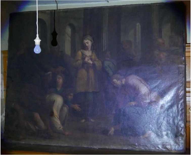 Selon la base de données POP, ce serait une copie d’un tableau de Raphaël. C’est cet élément mais aussi son traitement pictural et sa taille particulièrement grande qui en font un véritable chef d’oeuvre local. C’est pourquoi nous avons décidé de nous engager pour la restauration de celle-ci.
