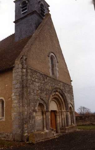 La façade ouest comporte, logé dans un avant-corps, un portail en plein cintre, accosté de deux arcades aveugles. Ce portail présente trois voussures reposant sur des colonnettes à chapiteaux engagées dans les angles des piédroits par l’intermédiaire d’un tailloir continu à ressauts qui se prolonge jusqu’aux arcatures brisés, billettes, pointes de diamants, palmettes, fleurs et feuilles stylisées, quadrilobes en hélices… Très soigneusement mis en œuvre, en particulier sur la façade ouest , cet ensemble témoigne de l’activité d’un atelier de bon niveau technique, peut-être lié à l’existence dans le voisinage des carrières de pierre de Vallenay.