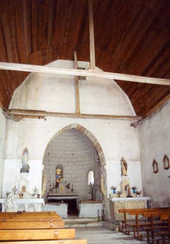 La nef, simple rectangle de 18 mètres de longueur et de 7,50 m de largeur, couvert d’une charpente lambrissée en berceau, ouvre par une arcade brisée sur un chœur plus étroit (7 m x 5,50 m), dont la travée droite, voûtée en berceau, est renforcée sur chaque mur lacérai par trois hautes arcanes en plein cintre, portées sur des fûts couronnés de beaux chapiteaux. Le chœur se termine par une abside arrondie, voûtée en cul-de- four.