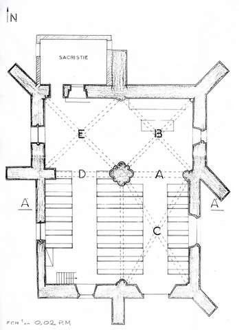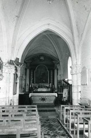 Selon les auteurs anciens, l’église actuelle daterait du xiie s. avec des remaniements au xve s. En fait, il est bien difficile aujourd’hui de reconnaître les parties romanes du monument, tandis que la sculpture des chapiteaux indique, pour la partie flamboyante, une datation de la fin du xve s. ou du siècle suivant. Quoi qu’il en soit, l’église se présente comme un monument complexe malgré sa taille modeste. On peut discerner tout d’abord trois travées voûtées en L, probablement contemporaines, et une quatrième travée constituée par une adjonction moderne en appentis qui forme avec les premières un plan carré. D’autre part, cette travée semble avoir existé dans le plan primitif, et il est vraisemblable que le bâtiment était autrement orienté à l’origine. Au centre de l’édifice, un pilier complexe reçoit la retombée des croisées d’ogives par l’intermédiaire de très beaux chapiteaux ornés de feuillages, d’animaux fantastiques ou de têtes humaines, décor que l’on retrouve sur les chapiteaux des colonnes engagées qui subsistent le long des murs.