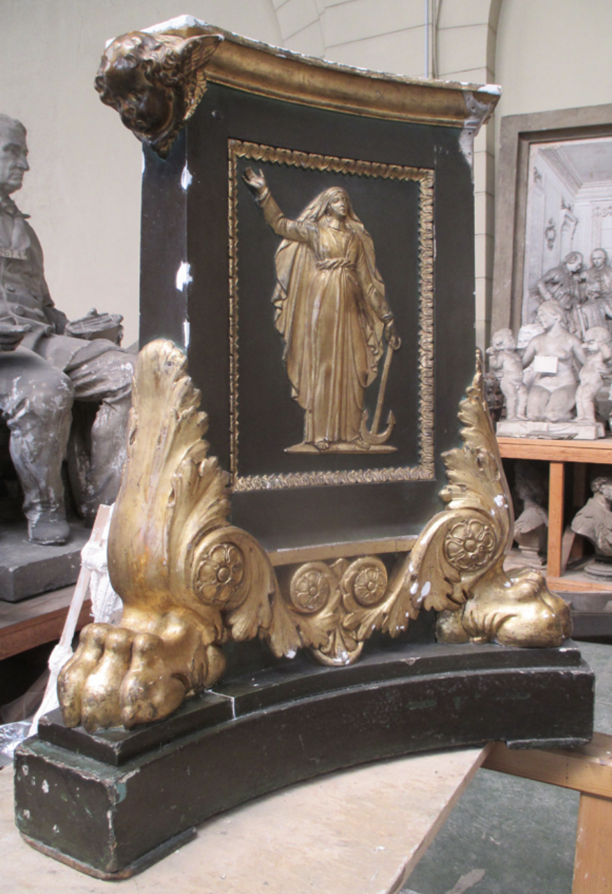 Le chandelier était conservé dans les réserves de la Ville de Paris à Ivry depuis des années. Après une étude scientifique menée en 2011 et un début de restauration permettant de réintégrer certaines parties manquantes, le chantier avait été interrompu faute de financements. La restauration, qui comprend un nettoyage complet, le retrait de la couche brune qui recouvre l’œuvre, le masticage des manques et les retouches ainsi que le remontage du chandelier, a été confiée au Groupement Perdu, atelier de restauration parisien.
