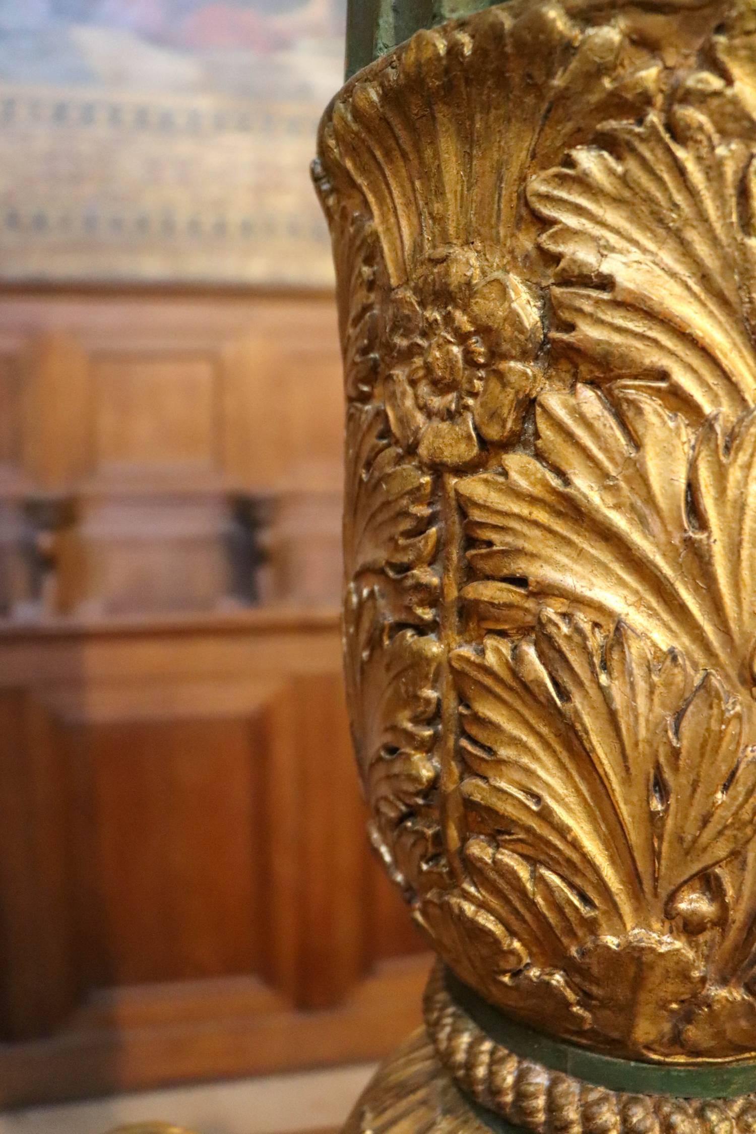 Haut des près de trois mètres avec ses éléments en carton-pierre, ce chandelier est une pièce rare dans les églises parisiennes. Sur sa base, trois faces sont ornées de représentations symboliques des vertus théologales (la Foi, l’Espérance et la Charité). Le fût est également richement décoré avec son sommet où vient se ficher le cierge pascal. Le carton-pierre est plus ponctuellement exploité pour créer du mobilier. Légère et solide, cette matière permet de fabriquer des éléments richement décorés à un coût moindre par rapport au bois ou à la pierre sculptée.