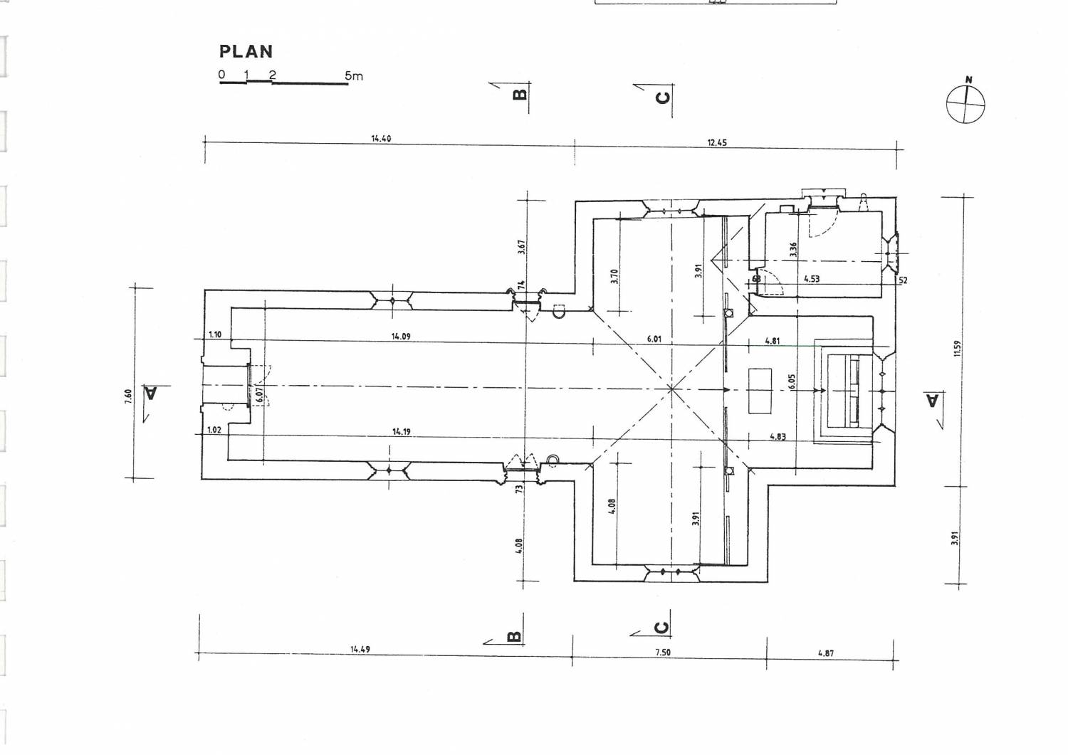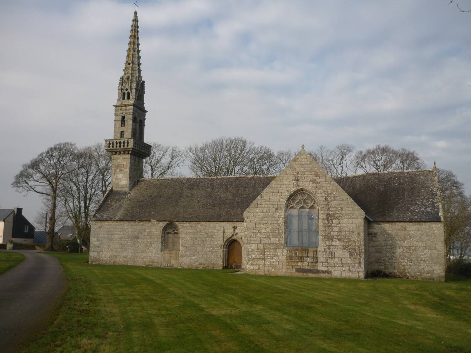 Plusieurs éléments permettent de suivre les époques de la construction. Les portes latérales à accolade et les éléments de vitraux qui subsistent remontent au début du xvie s. ; le calvaire du placitre, érigé à proximité de la chapelle au milieu du xve s., porte le nom gravé du fabrique G. LE GAC F, et la date d’une restauration : 1781 ; le portail ouest et le clocher portent la marque du style classique du xviie s. ; une inscription dans le bras nord du transept indique : BASTIEN : COEC : F 1744 ; la sacristie, plus récente, a été ajoutée en 1871-1872.