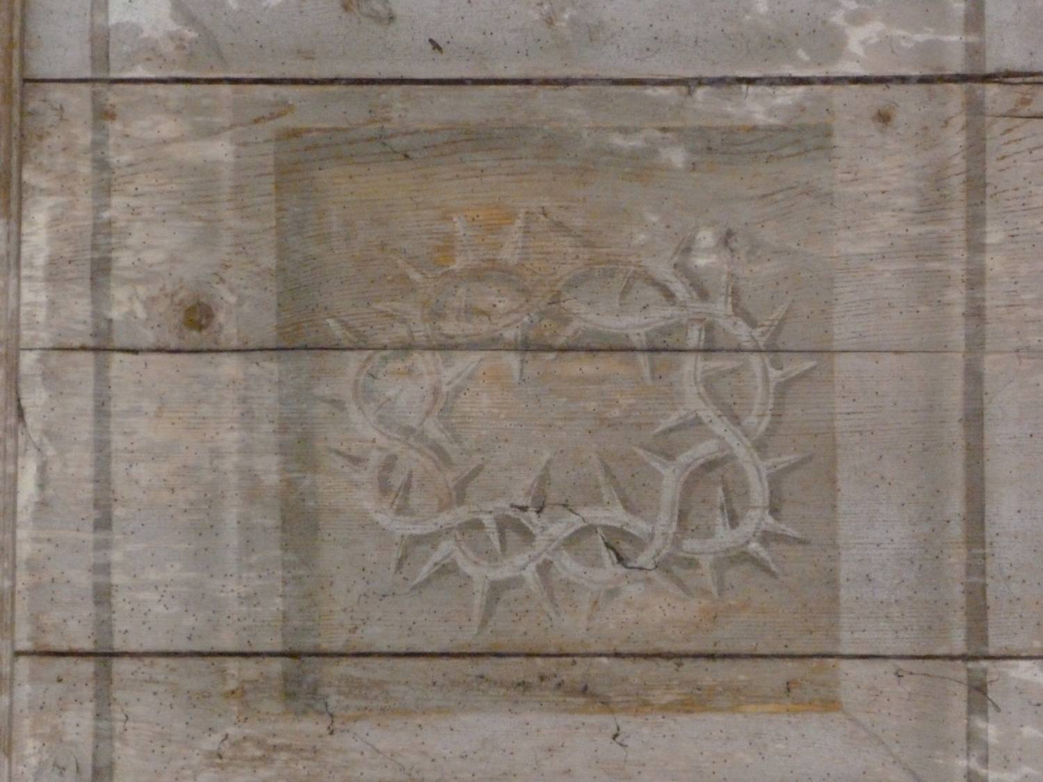 La fausse voûte lambrissée ornant la chapelle, ainsi que le chœur et l’autel, semblent avoir été mis en place entre le XVIIe et le XVIIIe siècle. La première a conservé les trois-quarts de son voligeage d’origine. Ces planches accrochées aux pièces de charpente sont peintes de faux caissons et de motifs décoratifs en trompe-l’œil : instruments de la Passion du Christ, monogrammes et initiales, prénoms bibliques, motifs floraux…