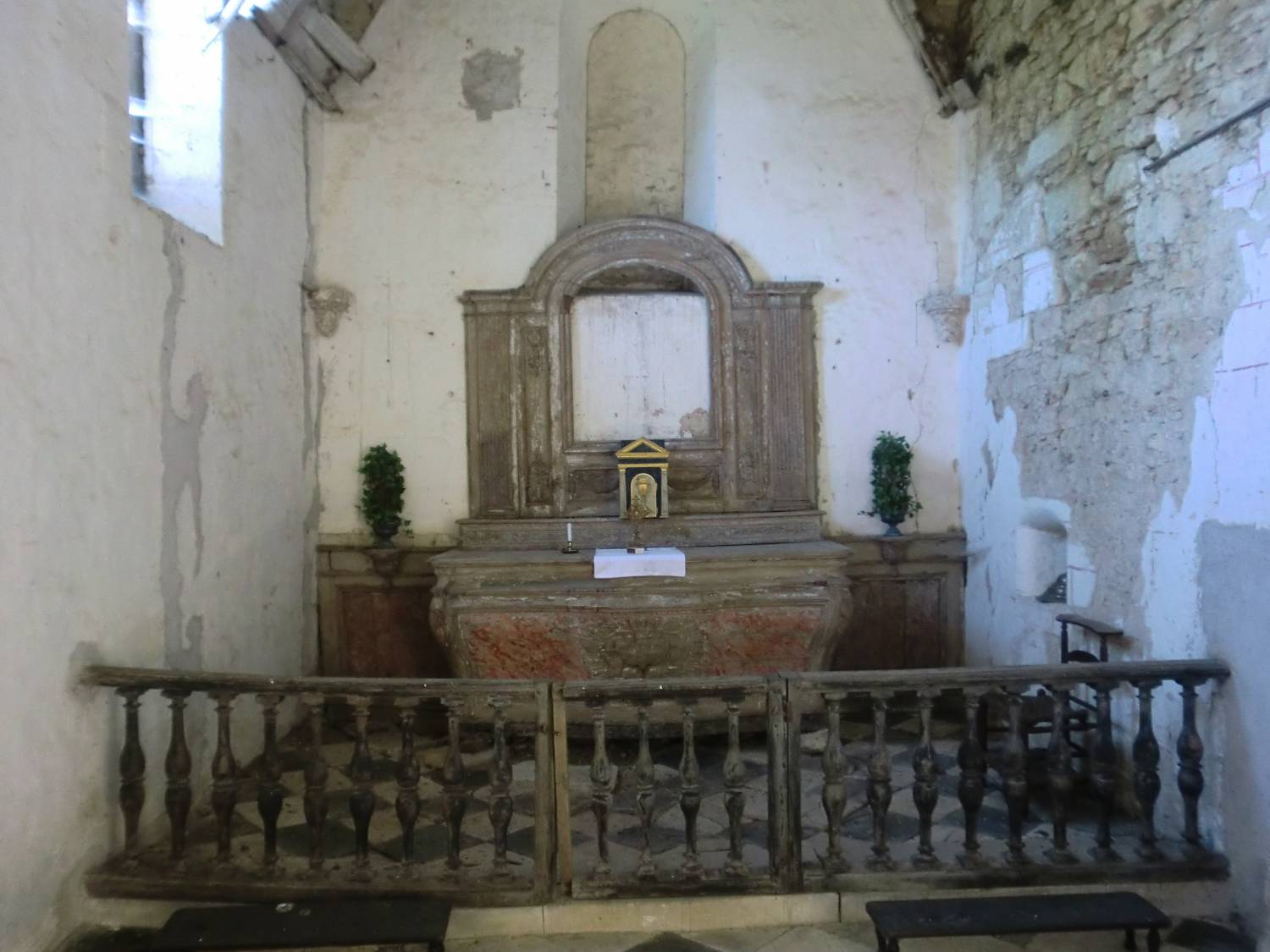 Le chœur, délimité par un balustre de communion, contient un autel en forme de sarcophage, peint de faux marbre dans des tons rouges et surmonté d’un retable (vide), en bois sculpté. Quelques vestiges de boiseries peintes en faux marbre, de part et d’autre de l’autel, comme les traces d’un enduit de faux appareil à joints ocre, en partie haute des murs, révèlent l’ancienne ornementation intérieure, complétée par quatre consoles placées aux angles et un bénitier conservé dans un décor architecturé.