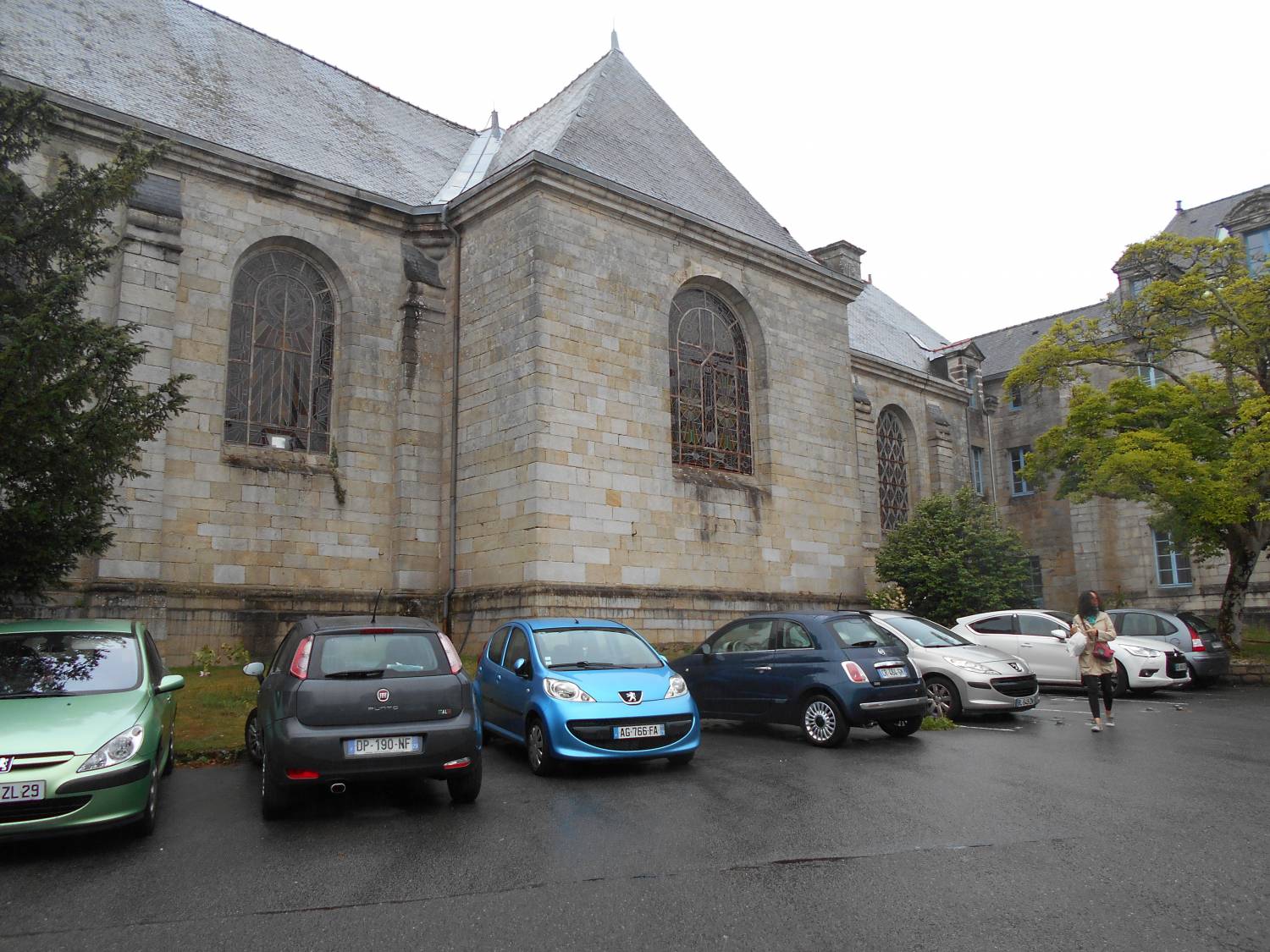 Un clocheton de pierre, dont il ne subsiste que la souche, a été ajouté à une date indéterminée audessus du chevet, il a remplacé un clocheton de charpente dont une partie de l’enrayure est visible dans le comble. La toiture se termine en croupes sur les bras du transept ainsi qu’à son extrémité audelà du chœur ; au niveau du transept le raccord se fait par des noues à pans coupés recouverts de zinc et un pyramidion, également couvert en zinc, surmonte la croisée. La partie de l’édifice qui se prolonge au-delà du chœur est aujourd’hui intégrée à la résidence Laënnec et les communications qui existaient au fond du chœur et dans le comble sont murées.