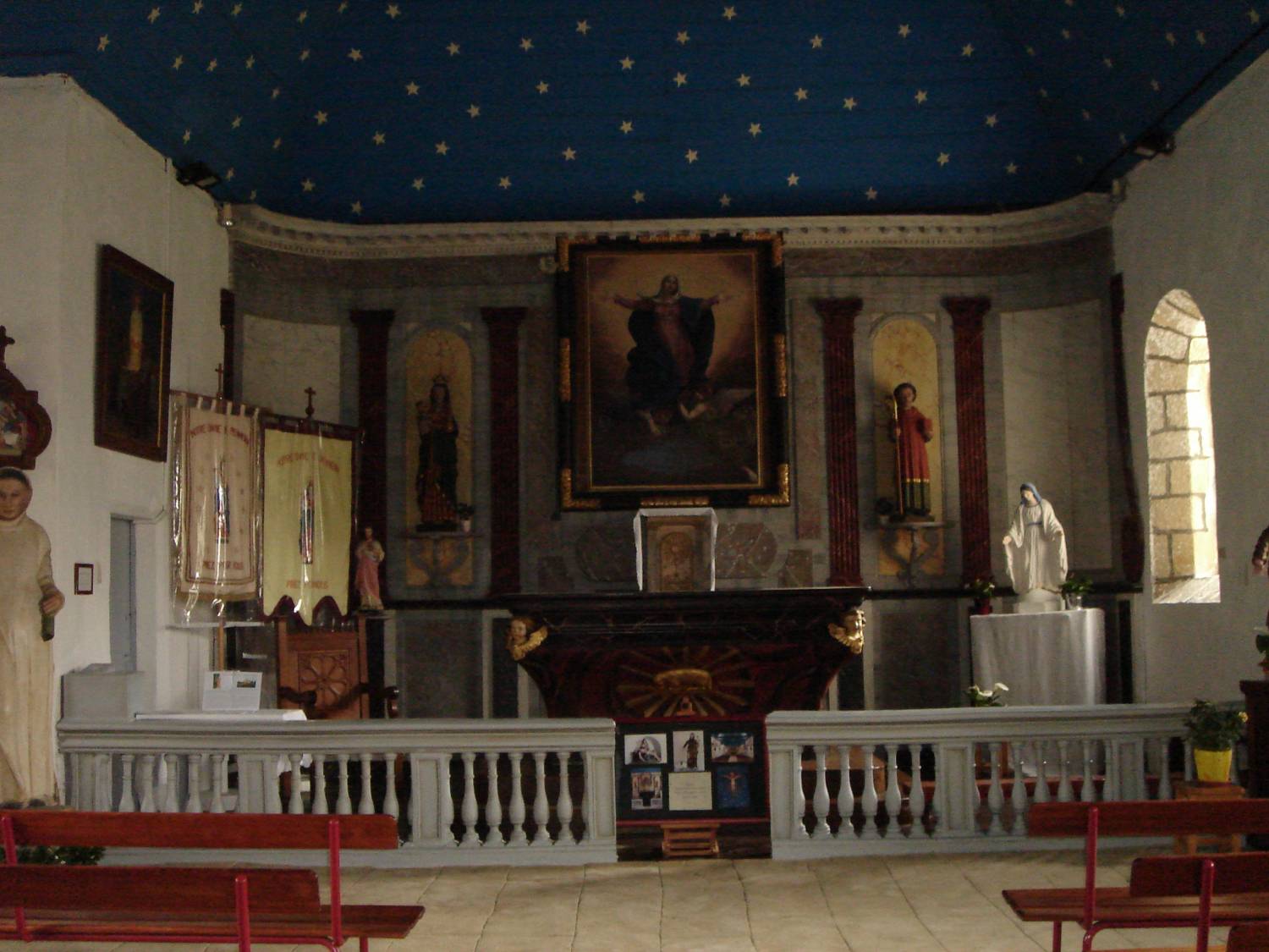 Le retable peint du maitre autel représente l’Assomption de la Vierge, dû à Parfait Pobéguin, daté de 1857. La chapelle abrite deux magnifiques statues en calcaire polychrome : un groupe de saint Bruno en abbé, accompagné de trois petits moines blancs, de la seconde moitié du XVe s. et une représentation de la Vierge de Pitié, du même matériau mais un peu plus tardive. Elles proviendraient du manoir de Cardélan en Baden. Trois autres statues en bois polychrome (saint Gildas et Notre-Dame de Penmern du XVIe s., et une seconde Vierge à l’Enfant du XVIIIe) comptent parmi les objets de qualité, ainsi que deux ex-voto et maquettes de procession, figurant des frégates napoléoniennes du premier quart du XIXe siècle.