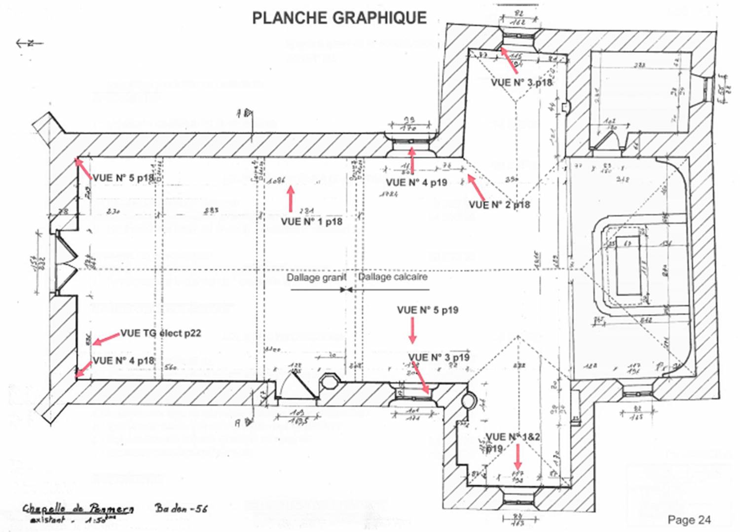 L’édifice présente plusieurs périodes de construction, du XVIe s. au premier quart du XIXe siècle. A l’origine, son plan était celui d’un rectangle. Comme l’a établi une étude de la charpente réalisée par Corentin Olivier, archéologue, une seconde phase de travaux a consisté en la reprise complète de la charpente au XVIIe s. : sur un modèle de charpente plus ancien, celle-ci a été reconstruite vers 1641-1643, comme l’atteste l’analyse dendrochronologique. C’est sans doute de cette période que date la porte ouverte sur le mur sud de la nef, au-dessus de laquelle se remarque un blason muet en réemploi (Keralbaud, seigneurs de Kerdelan, qui succèdent aux Rolland). C’est aussi à cette époque qu’est remonté le mur occidental, avec son porche surmonté d’un oculus. En 1821, le plan initial est modifié par l’adjonction de deux chapelles formant transept et d’un chœur. L’ensemble de l’édifice reçut un lambris de couvrement, bleu à étoiles, qui suggère la voûte céleste. La porte primitive du XVIe s. qui permettait l’entrée des seigneurs « prééminenciers » par le sud, est réutilisée dans le bras sud du transept. Les fenêtres en plein cintre sont contemporaines de cette phase de construction.