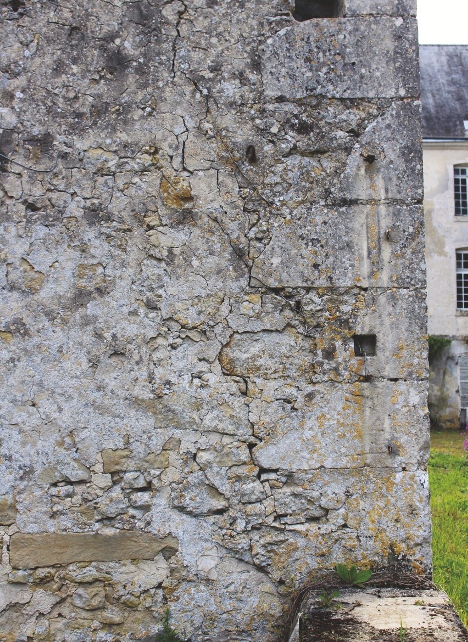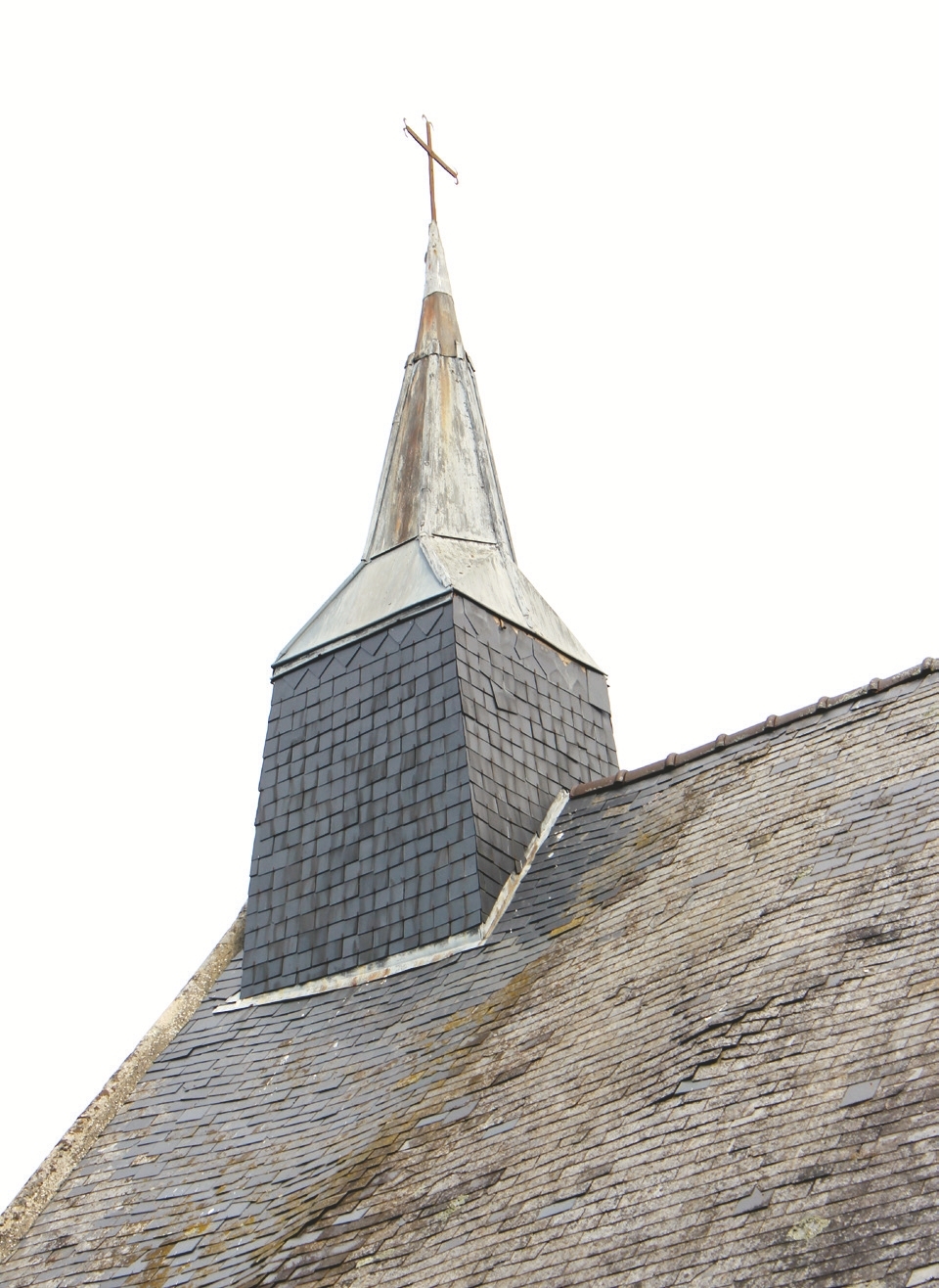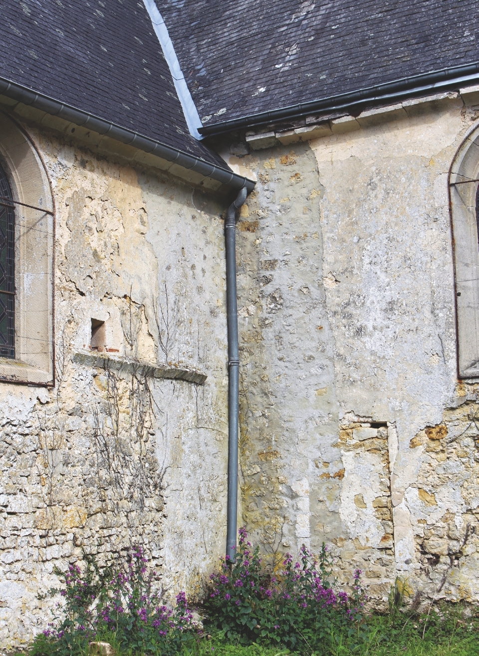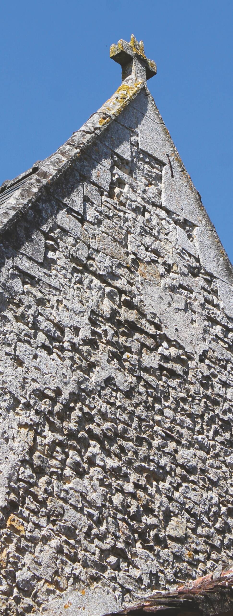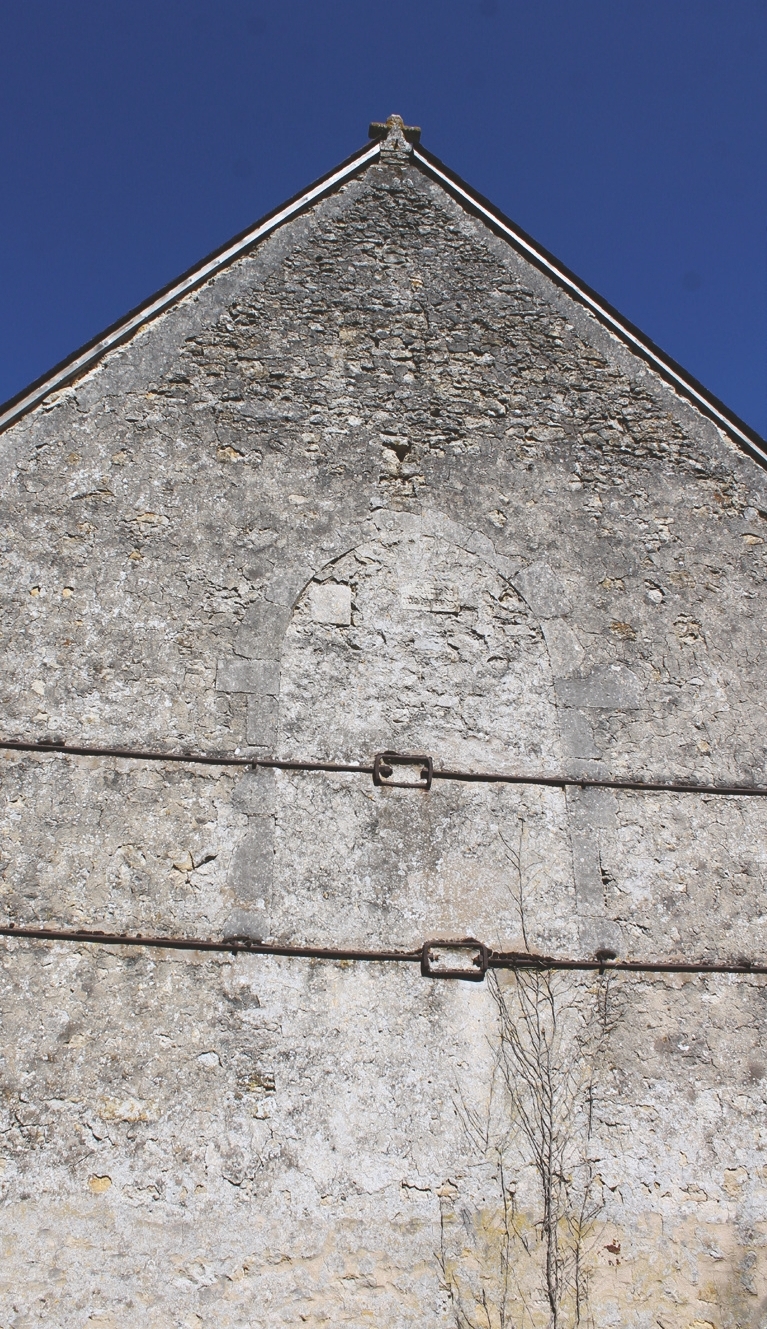 En façade occidentale, la trace d’un gable (ancienne rive de couverture) indique qu’un porche (ou ballet) précédait le portail