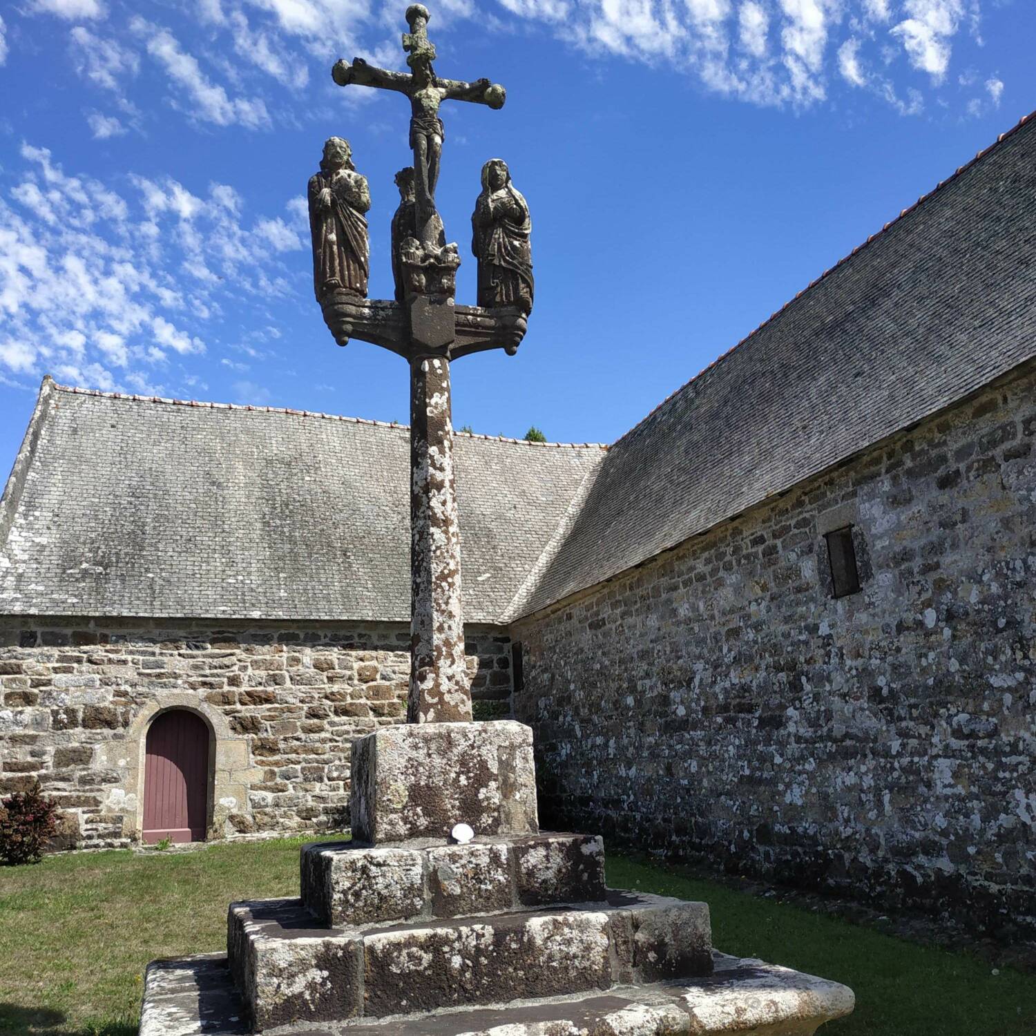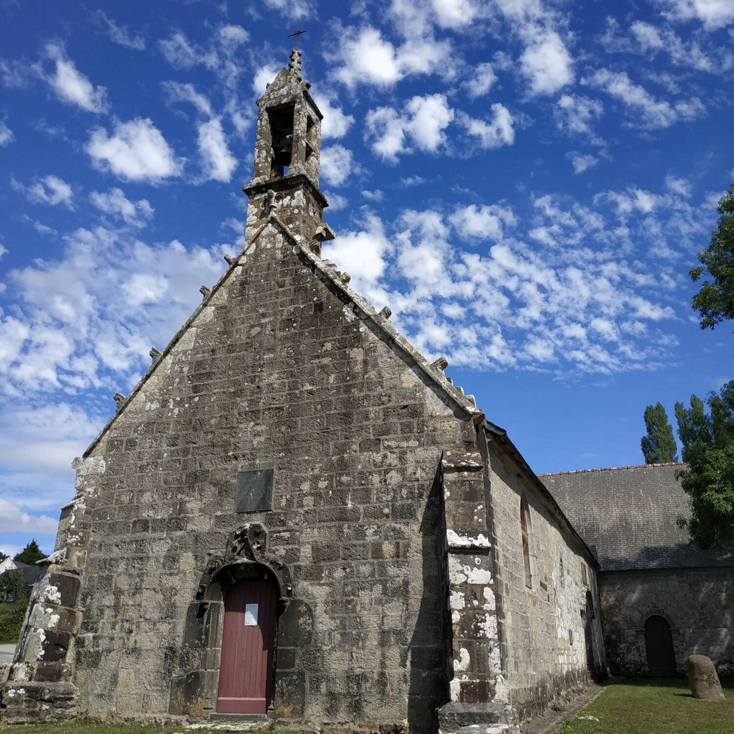La façade sud est décorée d’une porte moulurée, en anse de panier. Une inscription gothique domine cette porte et nous apprend que la chapelle fut fondée le second dimanche de mai l’an 1542, par Henry du Chastel, recteur de Plougastel, en l’honneur de Notre Dame de Confort et de Saint-Adrien.