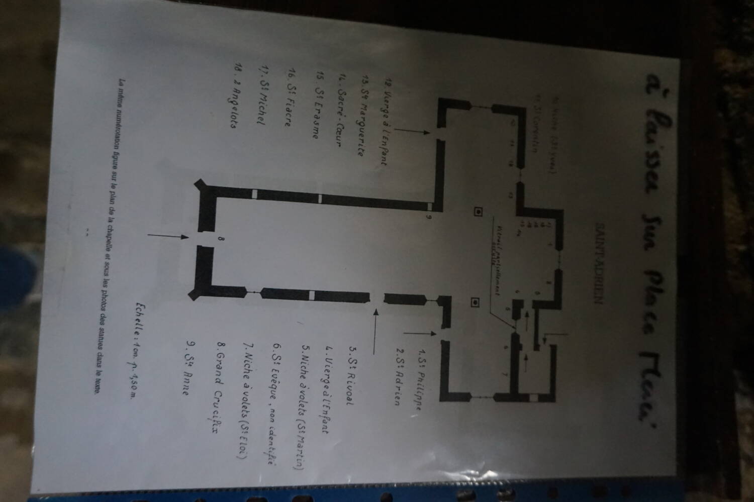 Quel est le titulaire de la chapelle ? Plusieurs ont pensé à Saint-Adrien qui prêcha la foi en Grande-Bretagne et mourut en l’an 720. C’est là une erreur. Le saint dont il s’agit est un martyr et, manifestement, il n’est autre que Saint-Adrien, martyr à Nicomédie, vers l’an 303. Avec Saint-Sébastien et Saint-Antoine l’ermite, Saint-Adrien fut reconnu au moyen âge comme ayant le privilège de défendre contre les maladies contagieuses.