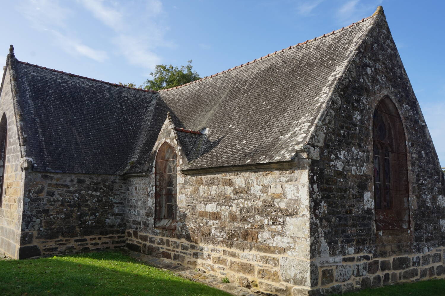 La chapelle Saint-Adrien est située à cinq kilomètres sud-ouest du bourg, au fond de l’anse de Lauberlach, sur la rive droite de la rivière. C’est un assez vaste édifice composé d’une nef, d’un transept et d’un petit chevet carré.