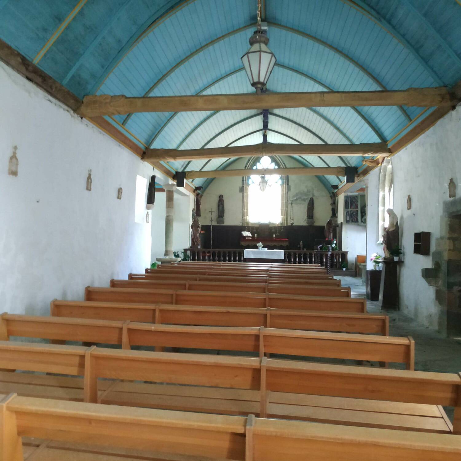 A l’intérieur, le pavé est fait de dalles de schiste et de grès quartzeux. A l’entrée des branches au transept, de sveltes colonnes monolithes supportent les tirants qui étayent la charpente.