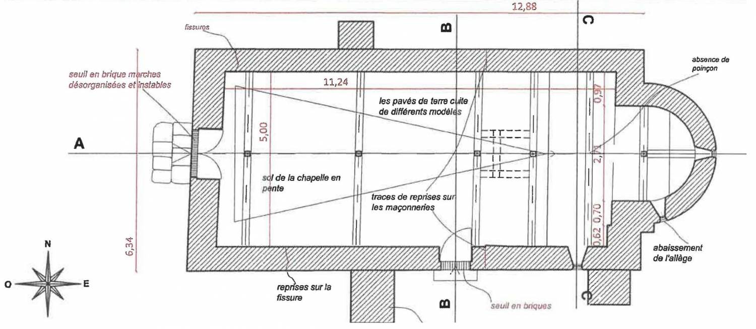 La chapelle est construite sur un plan à nef unique de 11m40 sur 4m50, se terminant par une abside en demi-cercle.