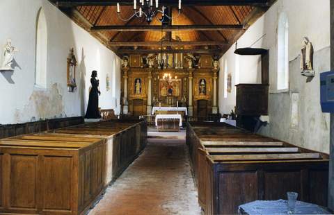 l’édifice. Elle est supportée par des poutres et des aiguilles apparentes de chêne. Le chœur est orné d’un vaste retable, datant du XVIIe s., gui sépare la nef de l’abside, aménagée en sacristie. Quatre colonnes à chapiteaux corinthiens en rythment la paroi et encadrent des niches abritant des statues de saint Lubin, saint Jouan et sainte Radegonde.