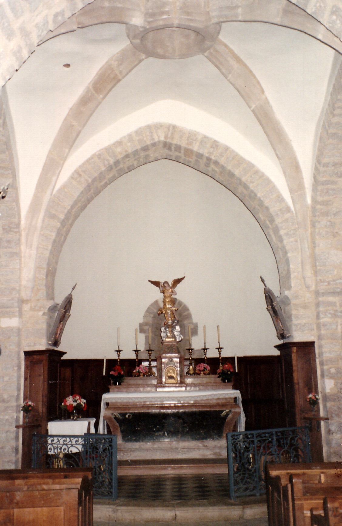 L’église se distingue par sa superbe abside semi-circulaire en cul-de-four, datant des XIIe-XIIIe siècles, et son chœur percé de trois fenêtres. Les deux chapelles latérales et la nef centrale ont été construites entre le XIVe et le XVe siècle. Un élément rare dans la région, le jubé, surplombe la nef. Le clocher, reconstruit en 1768, est surmonté d’une flèche et abrite un beffroi avec quatre cloches de tailles et poids différents, dont la plus grande, dédiée au glas, mesure 120 cm de diamètre et pèse 935 kg.