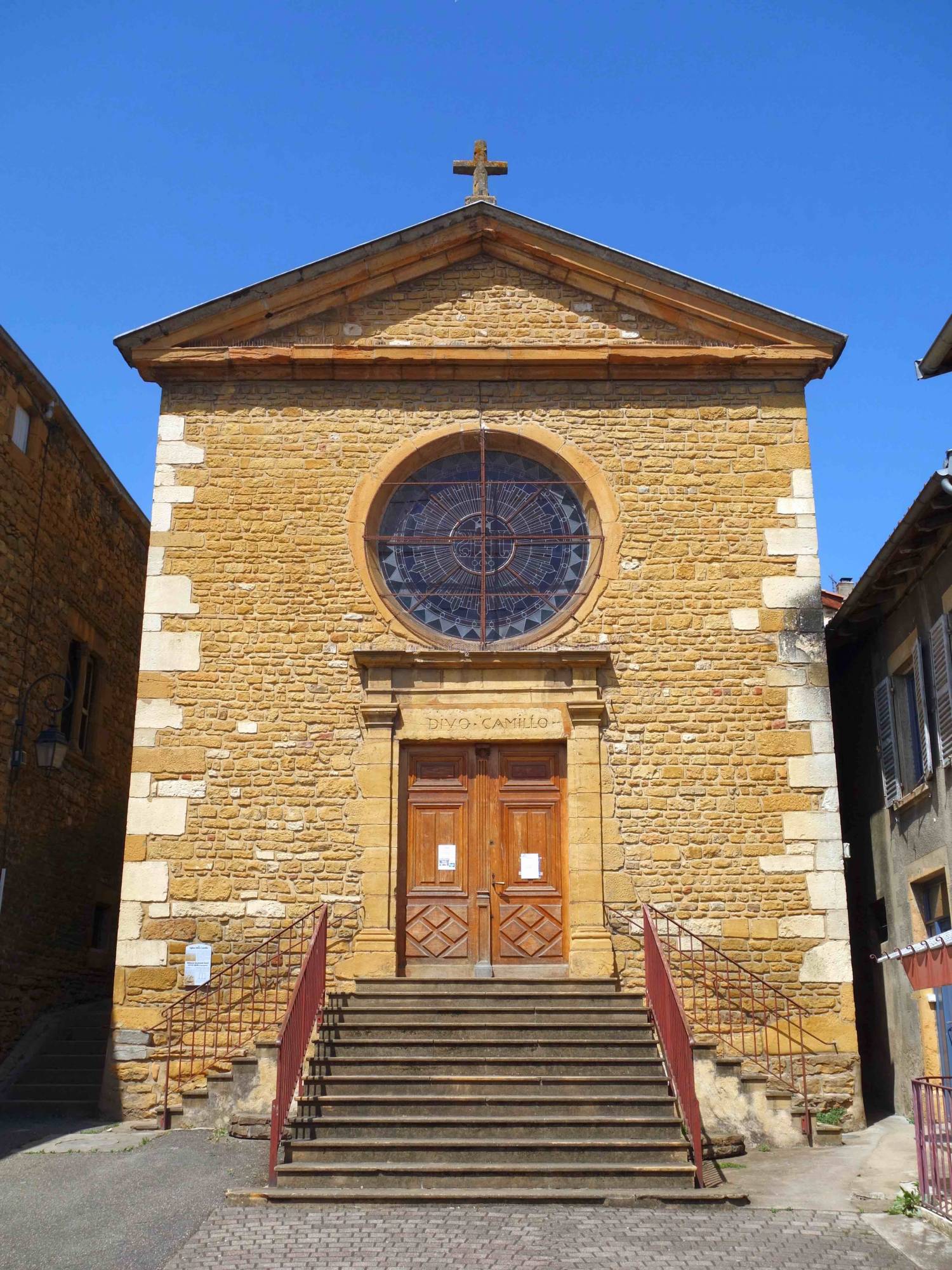Il est fort probable que le style de la façade avec son fronton, l’oculus ,l’inscription de l’architrave Divo Camillo, aient été choisis par Camille de Pramiral seigneur du lieu. Avec cette façade ressemblant à un temple gréco-romain, Châtillon fit encore parler d’elle car en Beaujolais prédominent des églises antérieures au XVIe ou des bâtiments du XIXe de style néo-gothique.