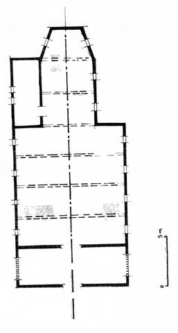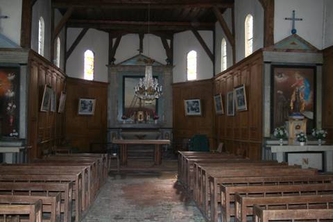 L’édifice se compose d’un porche d’entrée occidental de trois travées et d’une nef unique de six travées dont les deux plus proches du chœur sont plus étroites que les autres. Le chœur, composé de deux travées et lambrissé en partie basse, se termine par une abside pentagonale. Le chœur et la nef sont de même hauteur, couverts d’un plancher en très mauvais état qui repose directement sur les solives. Celles-ci présentent des traces de polychromie. Ces deux parties de l’église sont séparées par une poutre de gloire ornée d’un soleil doré.