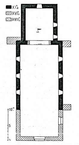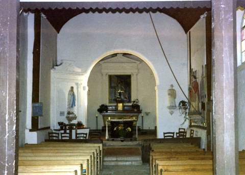 Celui-ci, presque entièrement en petit appareil, paraît dater du xie s. dans sa partie la plus ancienne. La nef assez courte et le chœur à chevet plat, plus étroit, n’étaient pas voûtés. Trois fenêtres percées au sommet des murs et actuellement obturées éclairaient la nef au nord et au sud. L’agrandissement de la nef vers l’ouest, l’addition de contreforts, le percement de fenêtres modernes, la réfection de l’arc triomphal et des combles lambrissés, la petite flèche en charpente sont des transformations des siècles suivants.Le mobilier du xvie s. est intéressant : les fonts baptismaux et un très beau panneau « sainte Catherine entre deux anges », réplique ancienne d’une œuvre de Luini.Pour achever la réfection et la mise en valeur entreprises par la commune, la Sauvegarde de l’Art français a accordé 10 000 F en 1986.