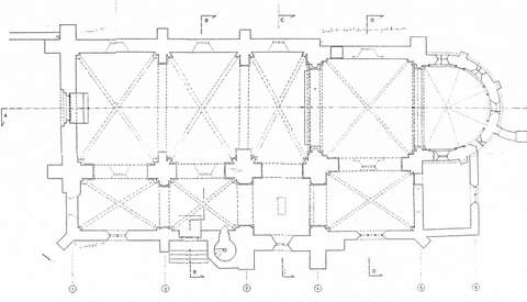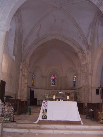 À l’intérieur, les travées voûtées de croisées d’ogives sont séparées par de larges arcs doubleaux au profil brisé, reposant sur des piliers engagés composés de colonnes et colonnettes. Les chapiteaux à feuilles d’acanthes stylisées, ainsi que les modénatures, rappellent étonnamment ceux de la cathédrale de Sens et permettent de proposer une datation à la suite de cet édifice majeur, c’està-dire à la fin du XIIe ou au début du XIIIe s., ainsi que d’en souligner l’influence évidente. Le sanctuaire de même époque est éclairé par cinq baies en arc brisé reposant sur des colonnettes ; il est couvert d’une voûte d’arêtes rayonnante.