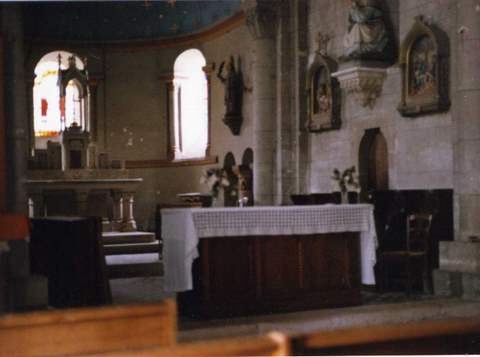 L’église du Chauray dédiée à saint Saturnin relevait, jusqu’à la Révolution, du prieuré voisin dont les chanoines étaient seigneurs du lieu. Il s’agit d’un édifice assez homogène des XIème et XIIème s. qui forme, avec des bâtiments encore conservés, un ensemble architectural de qualité au cœur du village. L’église est composée d’une nef unique et d’un chœur à deux travées terminé par une abside hémicirculaire ; elle est dépourvue de transept . La nef, éclairée de baies en plein cintre, est voûtée de bois avec entraits apparents. La première travée du chœur est surmontée d’une coupole octogonale en blocage, supportée par des trompes très plates caractéristiques de l’architecture romane de la région . La seconde travée est couverte d’un berceau brisé ; les colonnes sont surmontées de chapiteaux sculptés, à décor végétal mais aussi zoomorphe : aigles et animaux fabuleux. Leur style suggère le troisième quart du XIIème s. L’abside est ornée d’une arcature basse, avec des colonnettes semblables à celles qui en cadrent les trois fenêtres du cul-de-four. Elle est entourée, à l’extérieur, d’un bandeau de dents de scie et soutenue par des contreforts rectangulaires peu saillants. Sous le comble, la corniche droite repose sur des modillons à copeaux et à masques. La tour, aux proportions importantes, est le fruit d’une reconstruction datée de 1692. Elle est ouverte d’un étage de fenêtres géminées et surmontée d’une flèche en ardoise. Pour la réfection de cette flèche la Sauvegarde de l’Art Français a accordé 54 000 F en 1989.