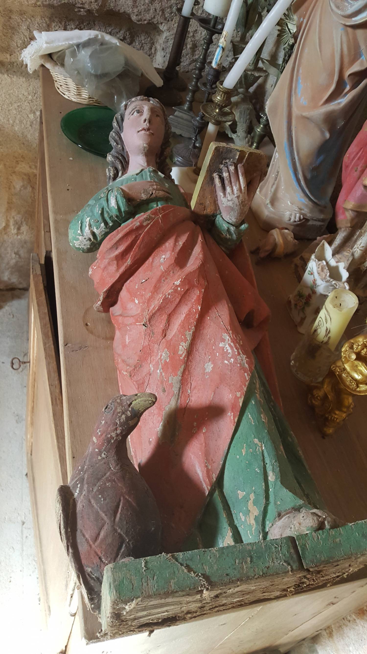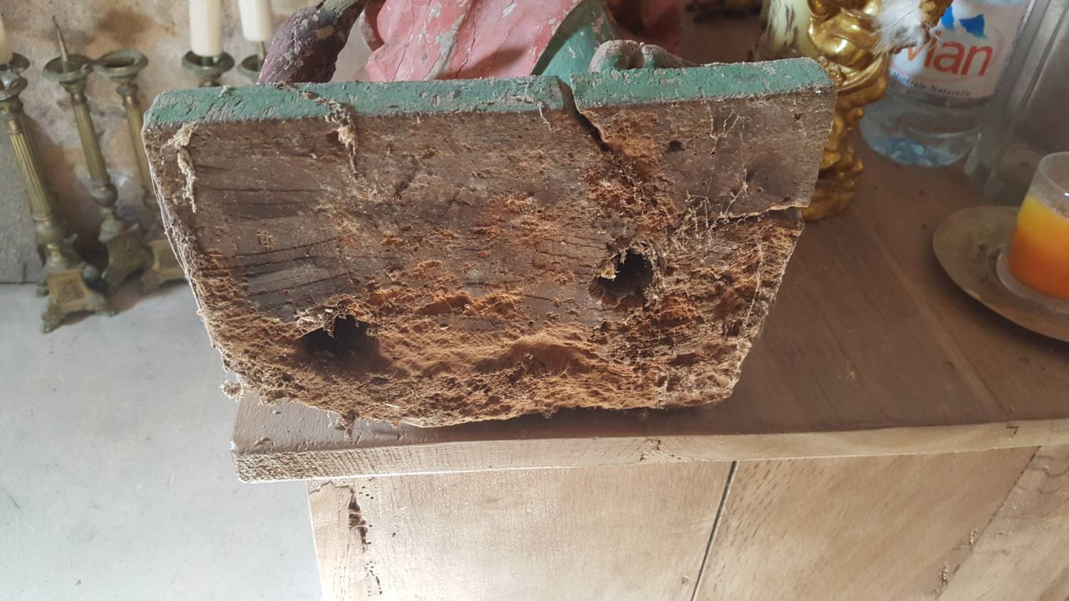 Les sculptures en chêne présentait une infestation et des lacunes. Leurs socles étaient abîmés et il était nécessaire d’améliorer leur stabilité.