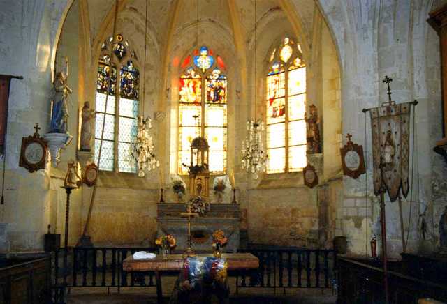 Les baies du chœur conservent encore, dans les soufflets, les tympans et les parties hautes des lancettes des fragments de vitraux de la première moitié du XVIe siècle. Cet ensemble, complété aux XVIIe et XXe siècles, a été classé monument historique en 1894 et restauré de 1886 à 1904 par Félix Gaudin. Une nouvelle campagne de restauration a eu lieu en 1992 par l’atelier Michel Mauret. La baie d’axe conserve une Résurrection du XVIIe siècle. Les vitraux du premier quart du XVIe s. de la première baie nord du chœur présentent des scènes de la Passion ; on peut rapprocher cette œuvre des vitraux de la Madeleine de Troyes. Sur la seconde baie nord, des phylactères portent les noms de saint Jacques et saint Nicolas ; les fragments conservés de bordures végétales sont en grisaille et jaune d’argent. La première baie sud du chœur, datée du premier tiers du XVIe s., nous a conservé l’image des donateurs présentés par saint Jean-Baptiste et saint François d’Assise, tandis que dans la seconde baie sud figurent des putti et une scène de la vie de saint Nicolas. La fenêtre est du bras nord du transept est ornée d’une Assomption datée de 1529 et d’une Dormition de 1540, celle du bras nord sud du transept d’un fragment du Jugement Dernier.