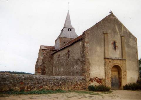 Eglise Saint-Denis. La petite commune de Chazemais, qui compte aujourd’hui 442 habitants, correspond à une paroisse de l’ancien diocèse de Bourges. Située à mi-chemin entre Saint-Désiré et Vallon-en-Sully qui conservent des églises romanes classées parmi les monuments historiques, elle possède elle aussi une intéressante église en partie romane. Avant le IXème s., cette paroisse passait pour dépendre de l’abbaye royale de Saint-Denis, ou d’une de ses dépendances, l’abbaye de la Chapelaude. Dès le XIIème s., la cure était rattachée à l’archevêché de Bourges. L’église actuelle, située au centre de la commune au milieu des prairies, se compose d’une nef sans bas-côtés, d’un transept et d’un chœur. La partie la plus intéressante du monument est le chœur, qui date de l’époque romane. Très simple, il est composé d’une seule travée voûtée en berceau. Le chevet plat et les deux murs latéraux sont percés de baies en plein cintre. La croisée du transept est couverte par une coupole sur trompe. Si le croisillon sud a conservé un aspect roman avec une voûte en plein cintre, celui du nord a subi des transformations à la fin de l’époque gothique. La nef, couverte d’une simple charpente, ne présente aucun traie marquant , elle est éclairée de deux fenêtres en plein cintre sur chacun de ses côtés. On devine l’emplacement d’une petite porte, du côté nord, qui est murée aujourd’hui. A l’ouest, la porte d’entrée en plein cintre s’ouvre dans un léger avant-corps de grès rouge, surmonté d’un glacis. Les murs gouttereaux sont eux aussi construits en grès rouge de la vallée du Cher, d’un effet assez pittoresque, bien qu’à l’origine ils aient été enduits. La toiture à deux versants de la nef est couverte en petites tuiles , alors que le clocher est couvert en essence de châtaignier.