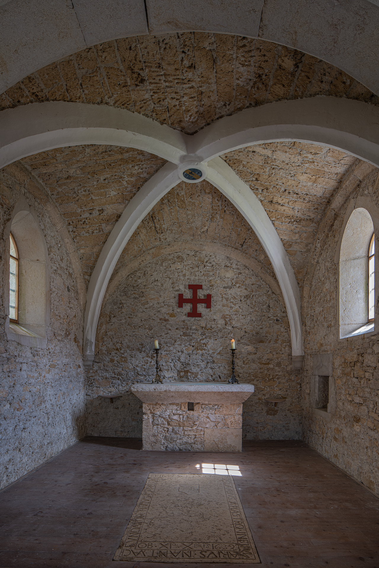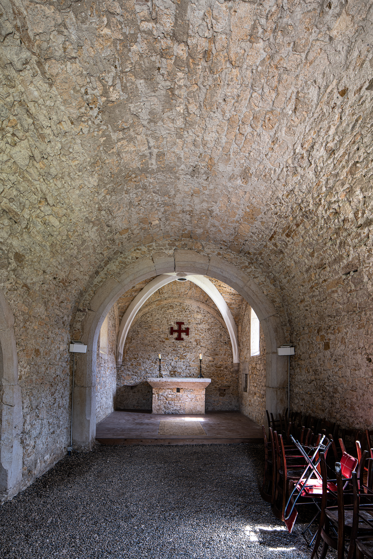La nef est voûtée en berceau, elle est prolongée par une petite abside couverte d’une voûte sur croisée d’ogives portant sur des culots à décors géométriques. Sur la clef centrale, on a fait peindre récemment les armes de la famille du Plastre. La chapelle est éclairée par des fenêtres en plein cintre de style classique (XVIIe siècle). Cet édifice est représentatif de la permanence du style gothique au début du XVIIe s. et des modes de construction locale, notamment en ce qui concerne ses pignons à redents, chaperonnés de petites dalles de pierre.