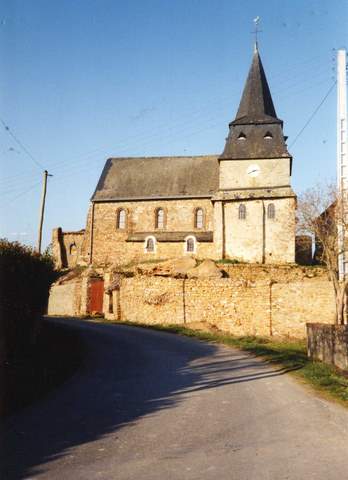 Le mur de soutènement qui borde le porche à l’ouest, est assez élevé par rapport au niveau de la route qui passe en contrebas : c’est peut-être le vestige d’une enceinte de protection. Il souffre d’un certain nombre de désordres, dus à la décomposition des mortiers et au ravinement que provoquent les eaux de ruissellement. Si la nef témoigne d’une intervention non négligeable du XIXe s., le clocher, trapu et massif, qui s’élève à l’angle sud-est de l’église, a su conserver son aspect d’origine ; il date vraisemblablement de la fin du Moyen Age. A deux étages, il est épaulé de puissants contreforts qui aboutissent à l’auvent d’ardoises délimitant les deux niveaux. Pour la réfection de la couverture, la Sauvegarde de l’Art Français a accordé une subvention de 24 000 F en 1996.