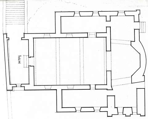 L’originalité de l’édifice, bâti sur une structure ancienne mais profondément remanié ultérieurement, notamment au XIXe s., tient à sa curieuse implantation sur une butte rocheuse. C’est d’ailleurs en raison de ce site que l’accès de l’église se fait à l’ouest par un escalier perpendiculaire à l’axe de la chapelle. Le plan se compose d’une nef de trois travées, flanquée de collatéraux le long des deux premières travées, d’un chœur ouvrant au nord sur une chapelle et au sud sur la base du clocher. Tandis que le volume intérieur de l’abside est à trois pans, son volume extérieur est semi-circulaire ; le chevet porte encore la trace d’ouvertures au tracé brisé ; elles sont de nos jours murées. L’appareil, un blocage de granit et de silex, ne présente pas d’intérêt particulier. L’église est précédée d’un porche cou vert qui s’appuie contre le pignon occidental et auquel on accède par l’escalier déjà mentionné ; cette construction, assez insolite, comporte un accès traité à la façon d’ un mur crénelé dont le travail révèle, comme les ouvertures de la nef et de ses collatéraux, d’importants remaniements du XIXe siècle.