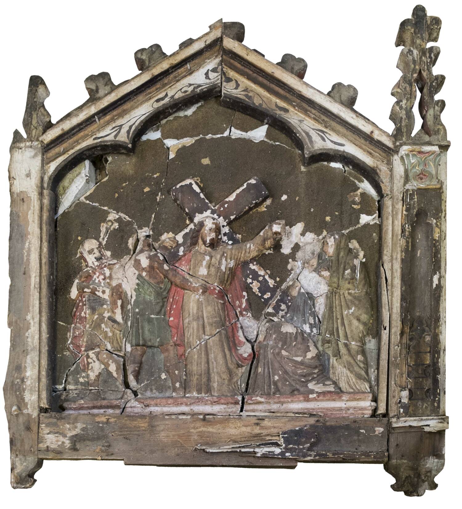 L’ensemble du chemin de croix est aujourd’hui dans un état fragmentaire. Seule une des stations présente un état complet avec son cadre. Ces éléments sont conservés au musée de Villèle dans un container. Un mécénat de la part d’Allianz va permettre de sauver ce patrimoine si singulier.