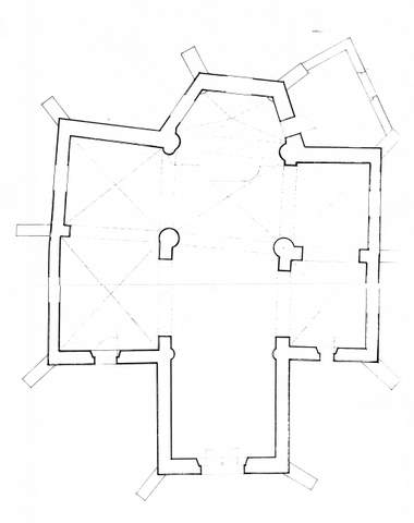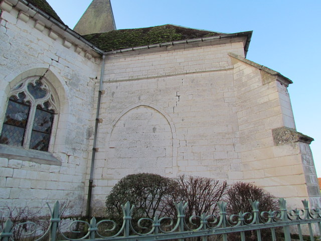 Le transept est également voûté en ogives et retombe sur des piliers carrés qui pourraient remonter à un édifice primitif. L’éclairage pénètre au niveau de l’abside et du transept la jouxtant par des fenêtres en arc brisé, bilobées et dont les remplages sont en forme de trèfle. Les fenêtres du second transept sont en plein cintre. À l’extérieur, les seules décorations consistent en des modillons qui soutiennent la corniche au-dessus de l’abside. Des contreforts en talus contrebutent les angles du bâtiment ainsi que la jonction des deux travées du transept. Un clocher de plan carré émerge de la croisée du transept occidental. Il est percé sur ses quatre faces de deux ouvertures en plein cintre barrées par un large abat-son surmonté d’une flèche en ardoise et précédé d’un petit campanile de plan également carré dont la partie en claire-voie abrite une cloche.