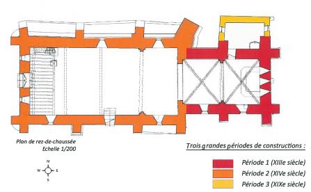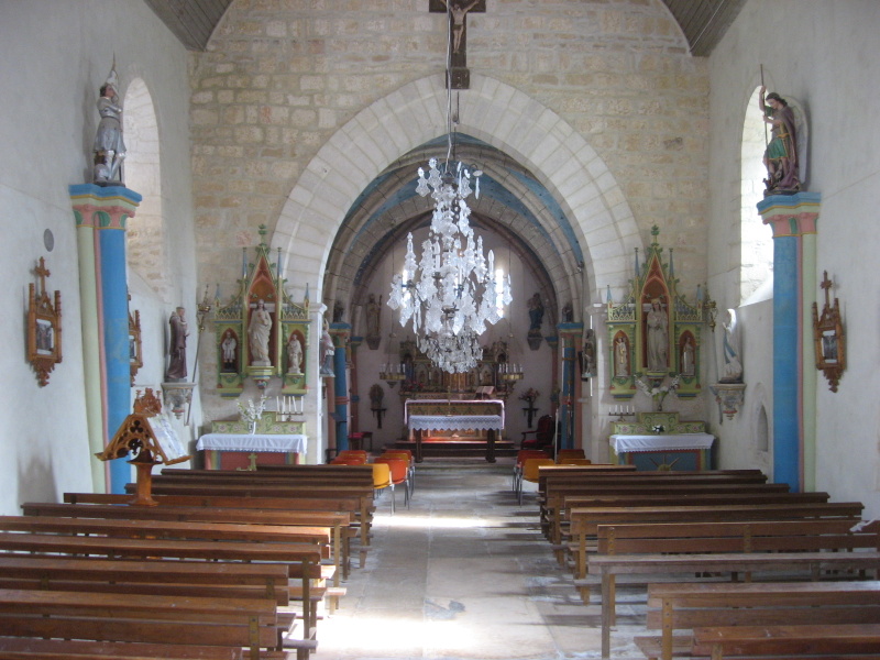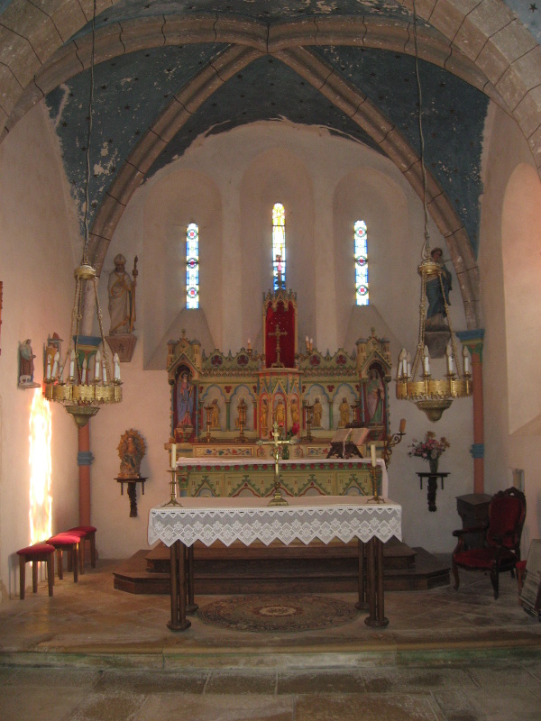 Église composée d’une nef unique gothique, greffé sur un chœur roman et gothique primitif légèrement plus étroit, composé de deux travées droites voûtées. Une sacristie y accolée sur le côté nord de la travée est. Le clocher a disparu.