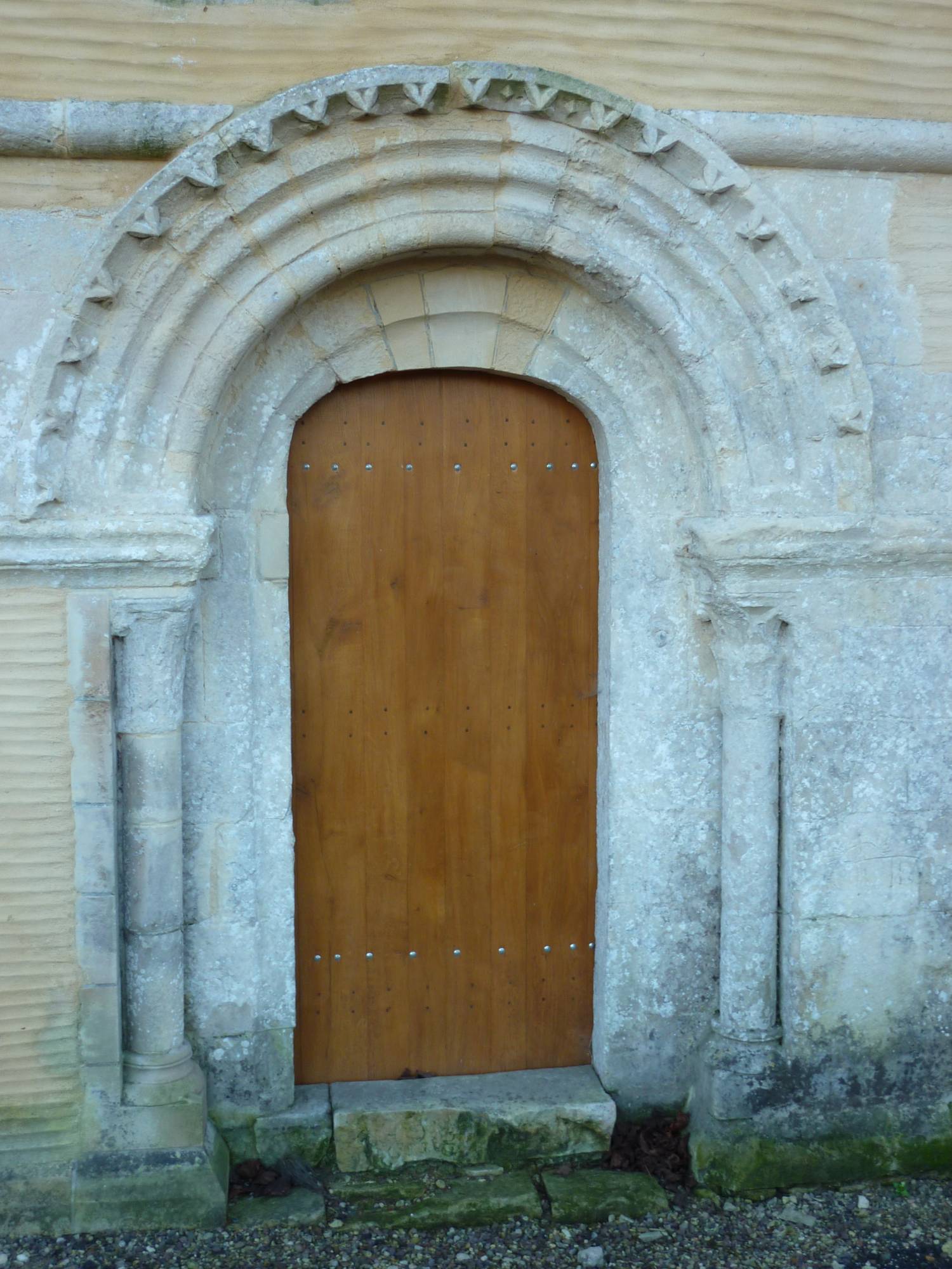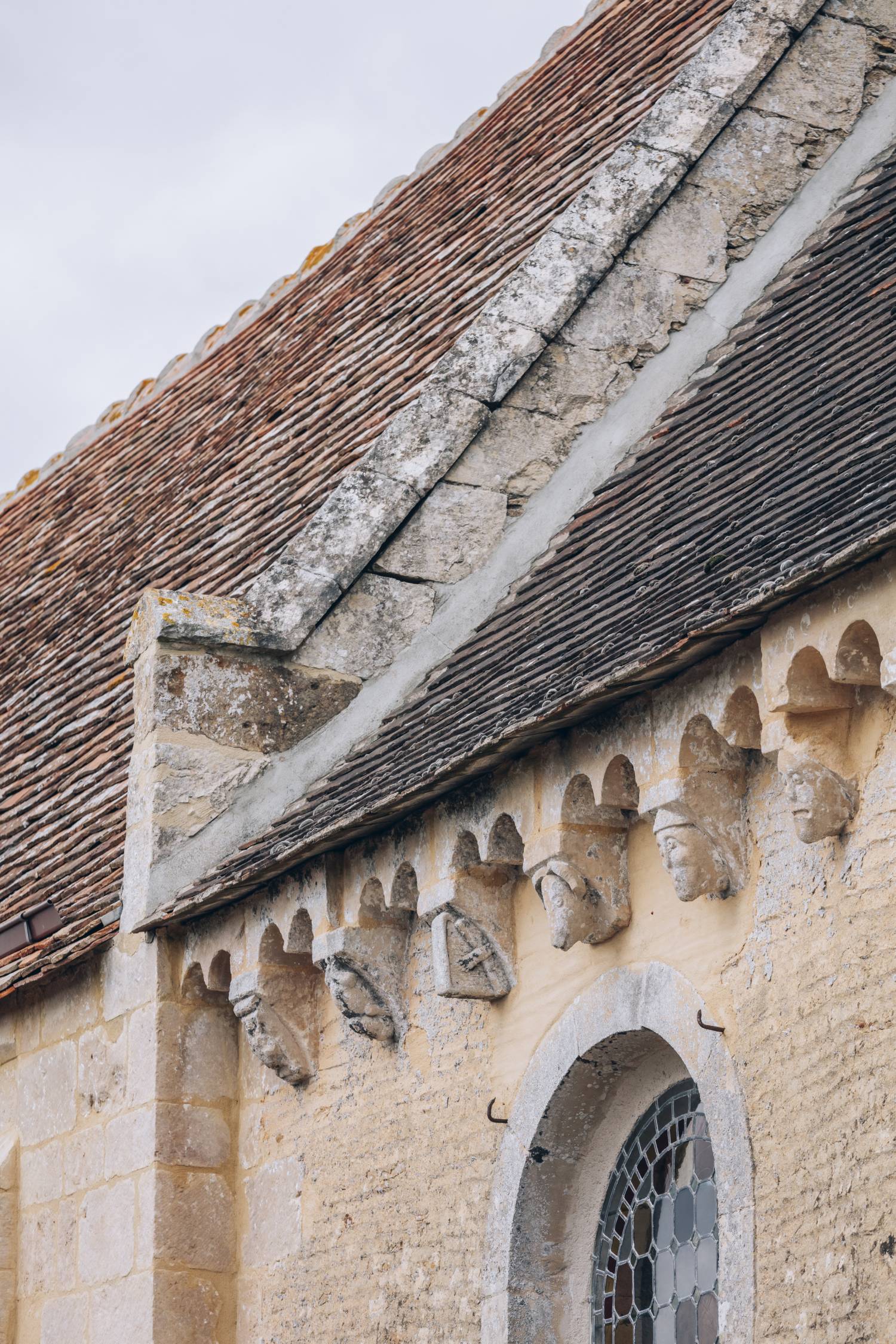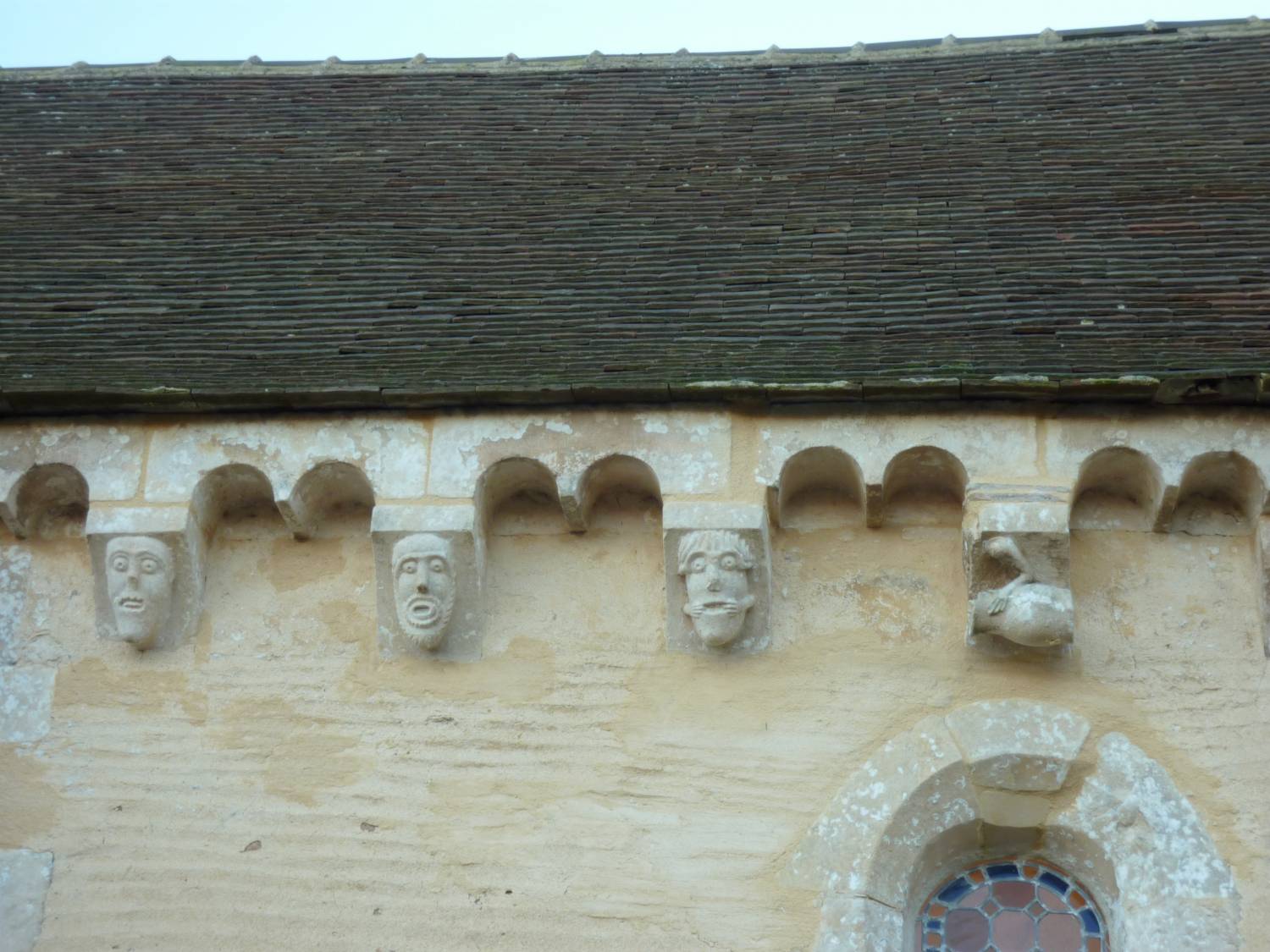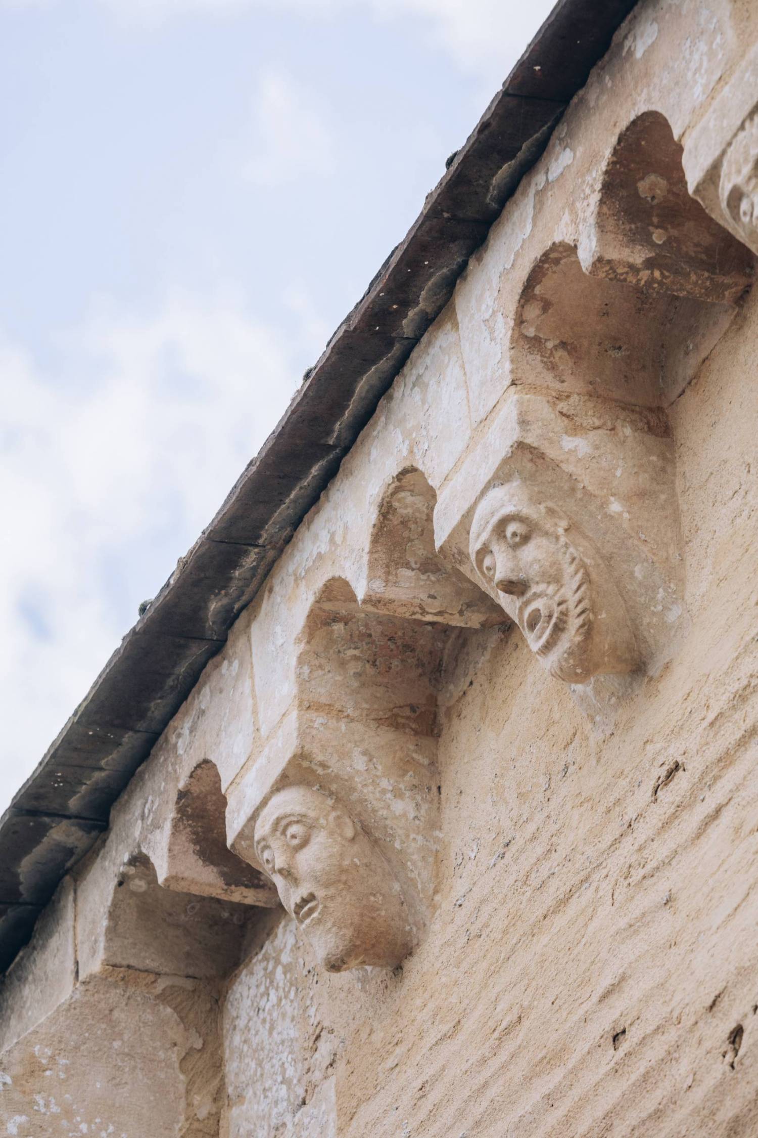 La corniche extérieure du chœur est remarquable par son décor de modillons variés, têtes nues ou avec capuches, et animaux. La porte du chœur est cintrée, à archivolte et bordée d’un chapelet de fleurs cruciformes.