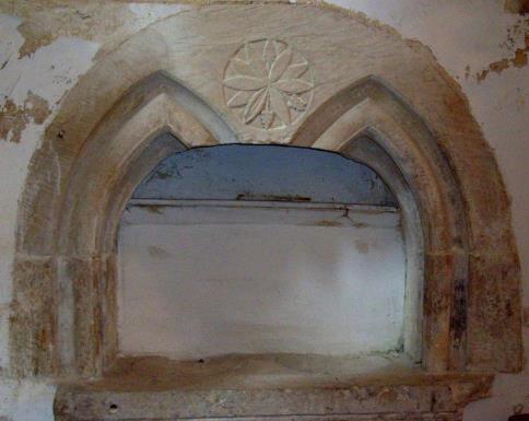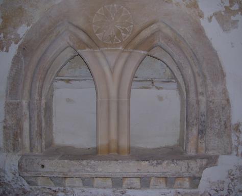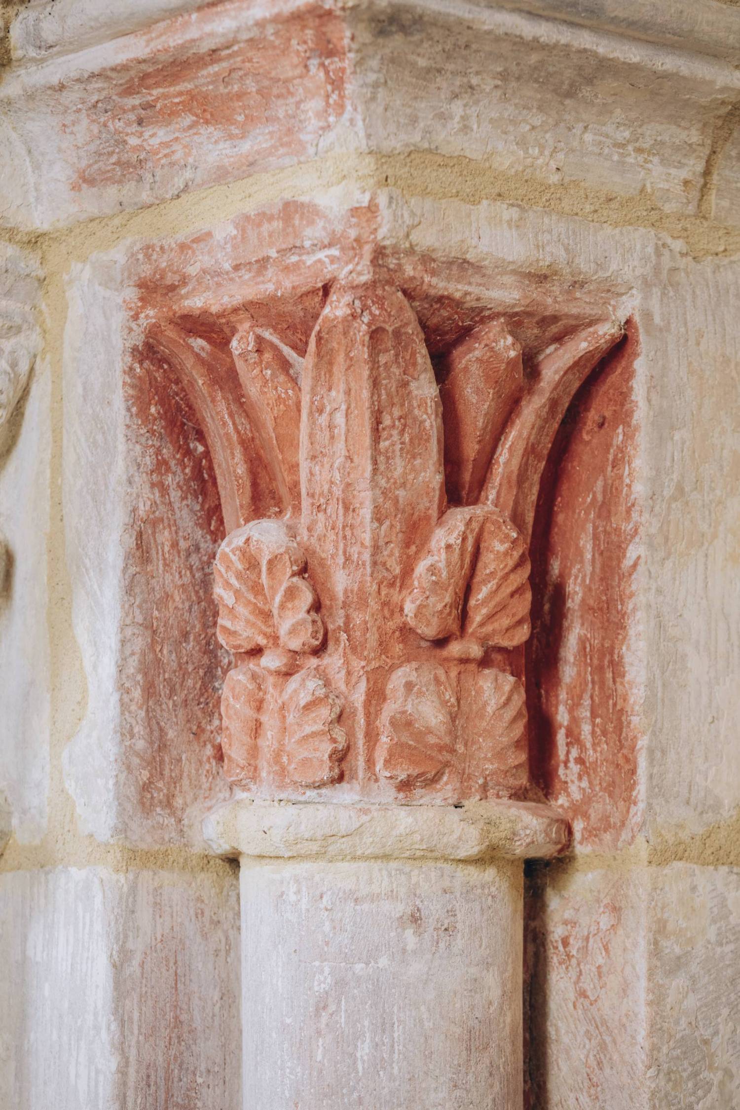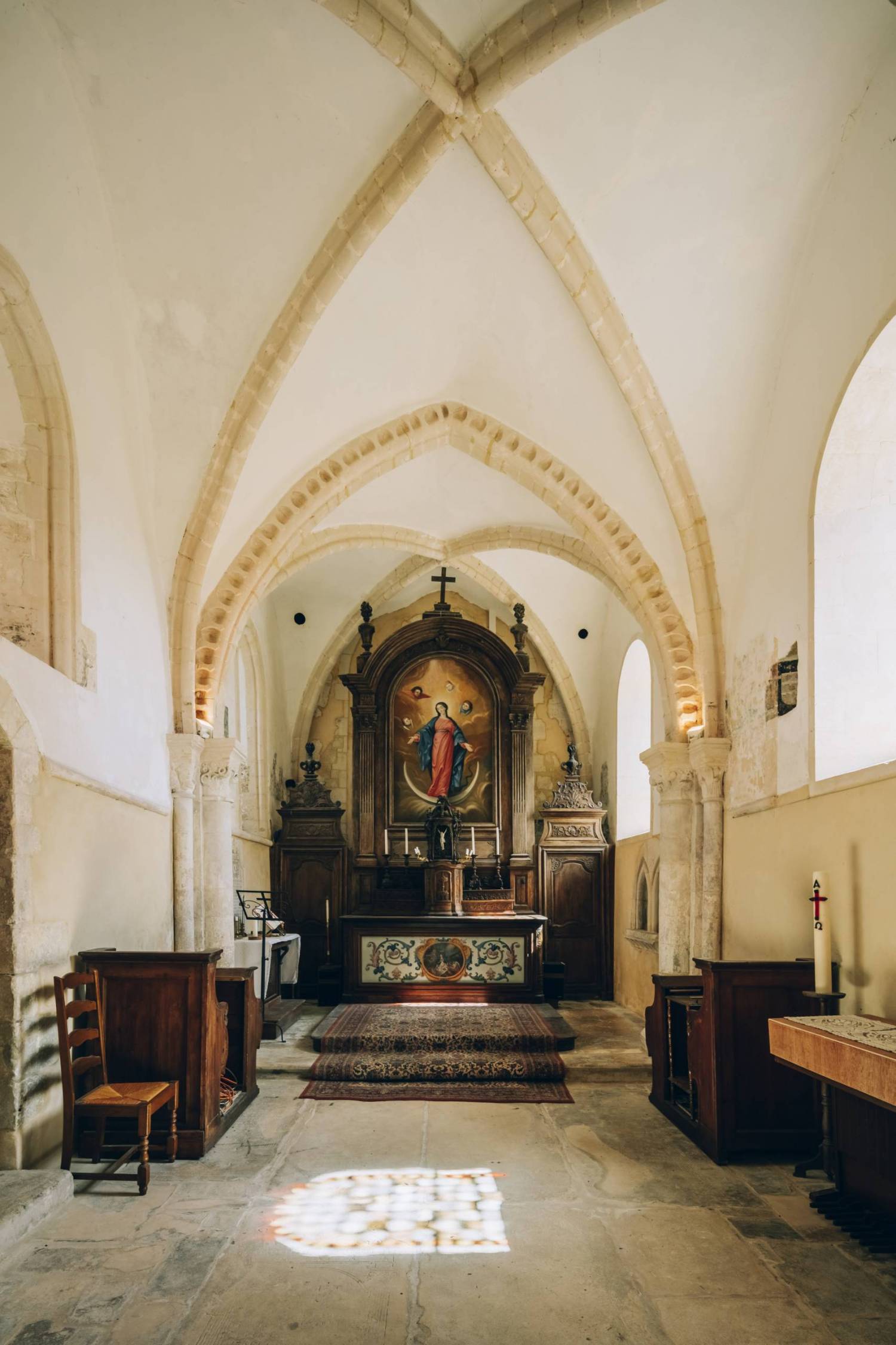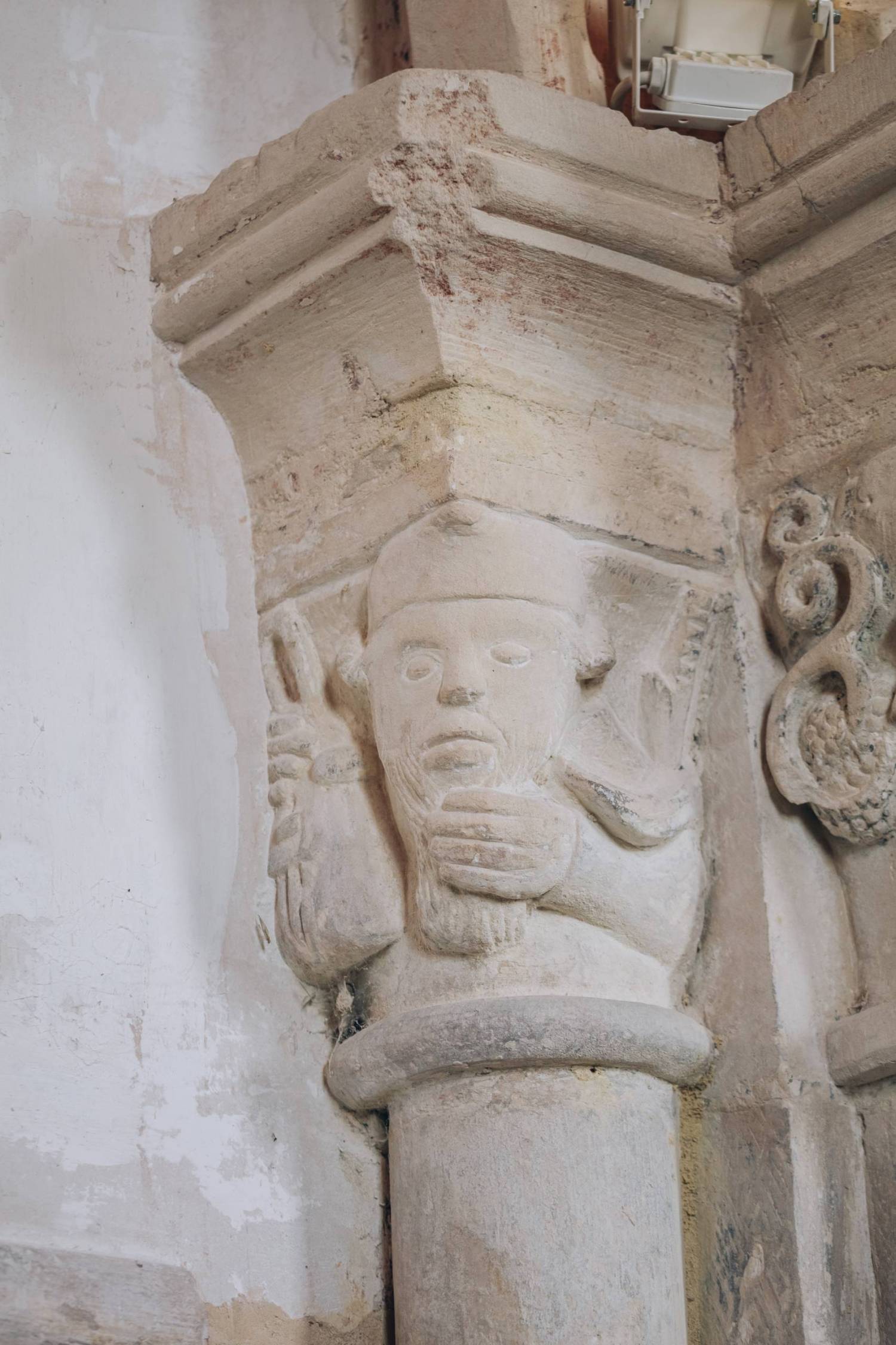 La corniche extérieure du chœur est remarquable par son décor de modillons variés, têtes nues ou avec capuches, et animaux. La porte du chœur est cintrée, à archivolte et bordée d’un chapelet de fleurs cruciformes.