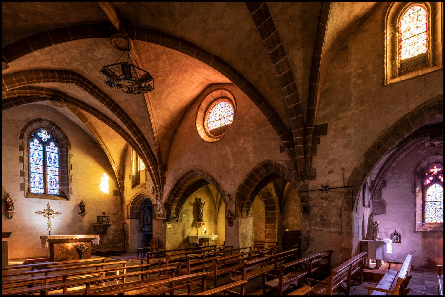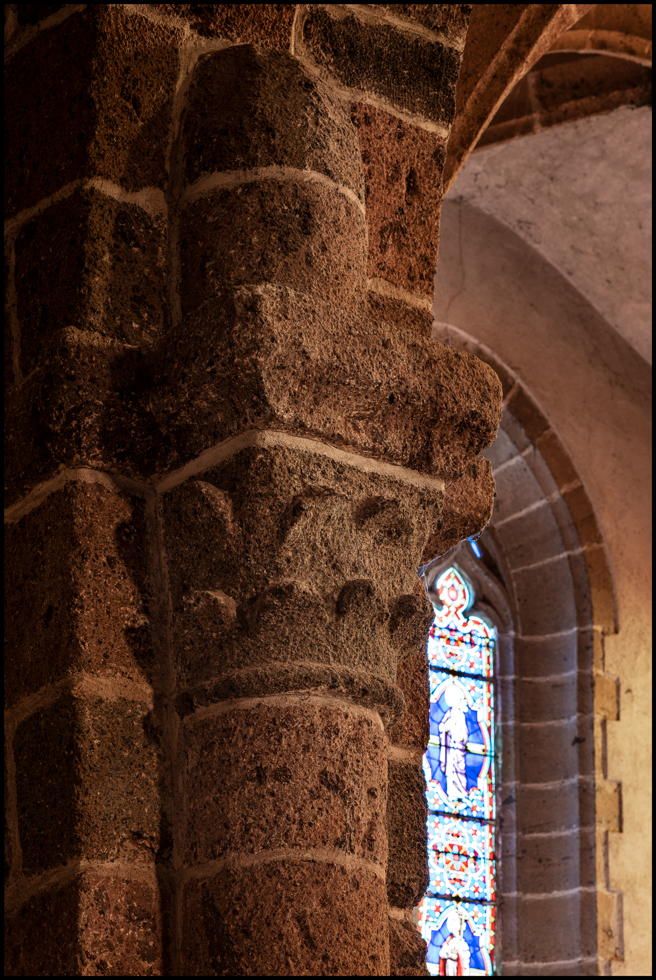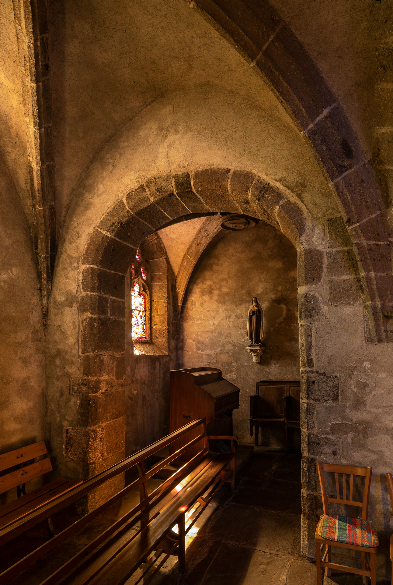 C’est dans l’une des chapelles du côté nord, voûtée en berceau, que l’on trouve les derniers souvenirs de l’édifice roman : deux colonnes engagées. Ceci est sans doute un fragment de ce qui était le transept. Au sud, se trouve une curieuse chapelle pentagonale, couverte de cinq arcs d’ogives à clef pendante, construite au xve s. Toutes les autres clefs de voûte de l’église sont armoriées et portent un décor figuré d’un ou deux personnages.À l’extérieur, la façade présente un portail à porte unique, surmonté d’un oculus percé dans le pignon découvert qui soutient le toit à deux pans reposant sur quatre rangées de génoises. En prolongement de la façade, côté nord, une tour clocher carrée est ajourée de baies qui conservent la trace d’arrachement de meneaux, aujourd’hui disparus. Ce clocher devait être coiffé d’une flèche octogonale en pierre dont il ne reste rien.Les travaux ont porté essentiellement sur la réfection des toitures qui se trouvaient être en très mauvais état. La Sauvegarde de l’Art français a accordé, en 1987, une subvention de 100 000 F, provenant du legs Dubois (comité d’action du 25 juin 1987).