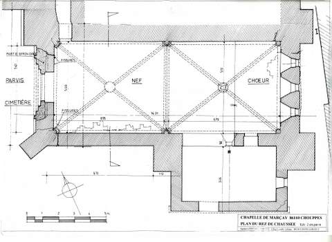 La chapelle de Marçay se présente comme un édifice à vaisseau unique, de deux travées, dépourvu d’ouvertures latérales, à l’exception d’une baie percée dans le mur gouttereau sud au-dessus de l’arcade ouvrant sur la chapelle latérale, construite au niveau de la travée de chœur. Si les parties les plus anciennes semblent dater de l’extrême fin du XIIe, voire du XIIIe s., le voûtement évoque plutôt une intervention du XVIe siècle. cette époque, la modification de la charpente et de la couverture entraîna la surélévation du mur-pignon et un changement de parti dans les deux baies du clocher-porche qui furent alors bouchées. Le mur- pignon fut surmonté d’un nouveau clocher, aujourd’hui disparu, mais dont les sources photographiques attestent l’existence. Plus tardivement enfin fut édifiée au sud une chapelle latérale.