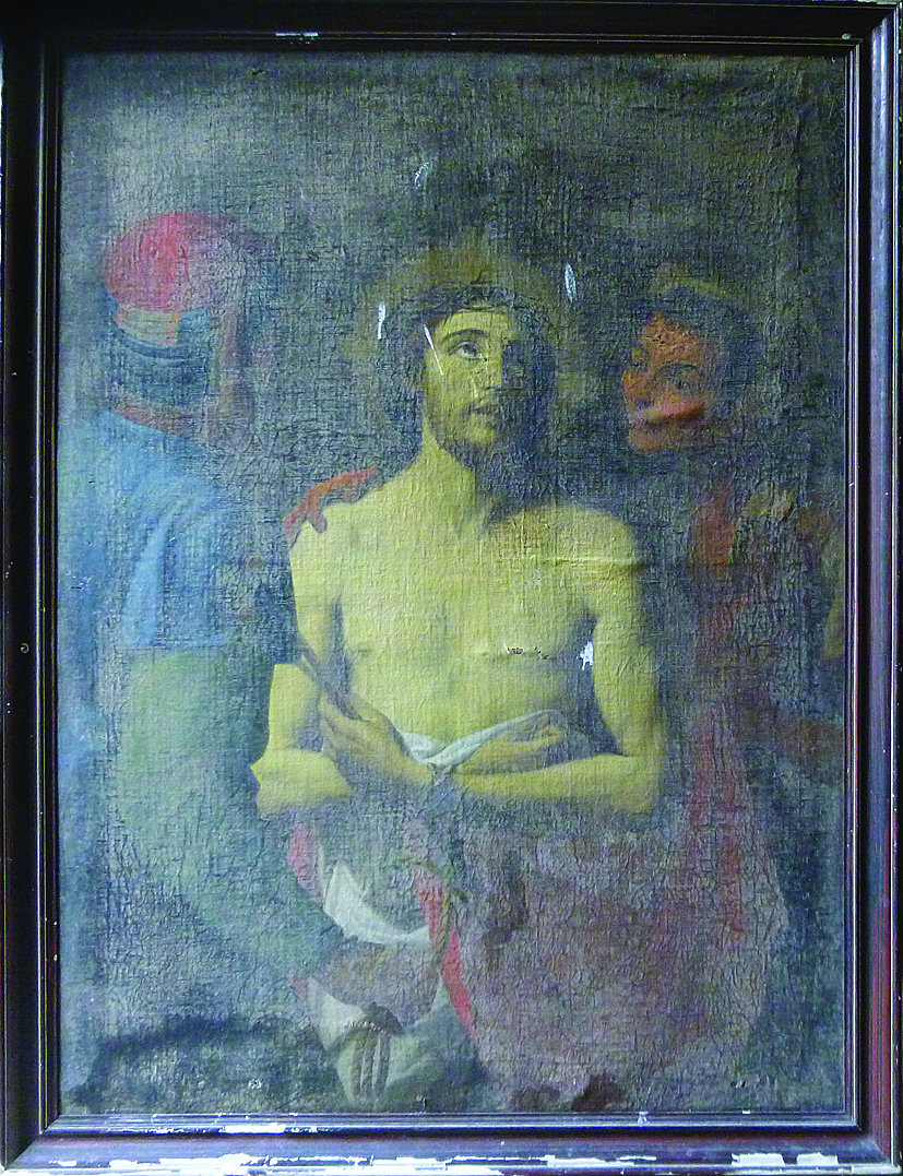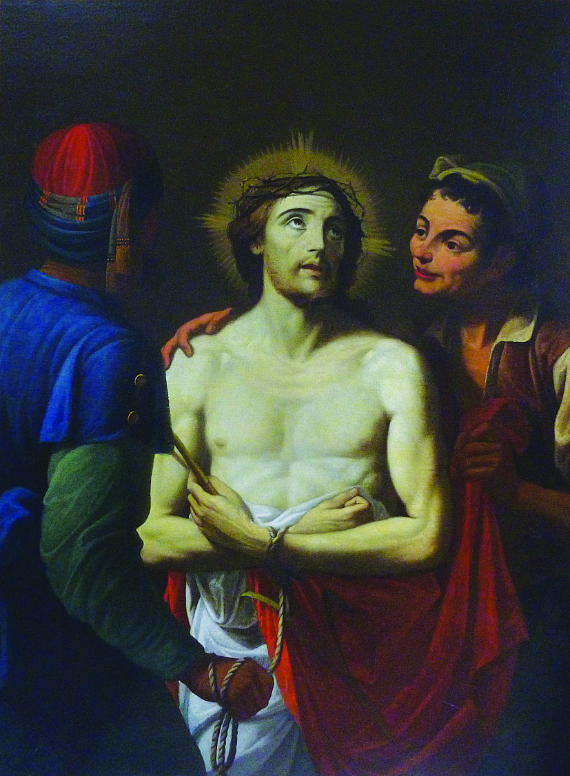 Après son interrogatoire par le préfet de Judée Ponce Pilate et sa flagellation, Jésus est désigné à la foule par le fameux « Voici l’homme ! » (Ecce homo)- et affublé des attributs dérisoires de sa royauté, la couronne d’épines, la tunique de pourpre et le sceptre de roseau. Il s’agit donc d’une mise en scène organisée par les bourreaux du Christ.