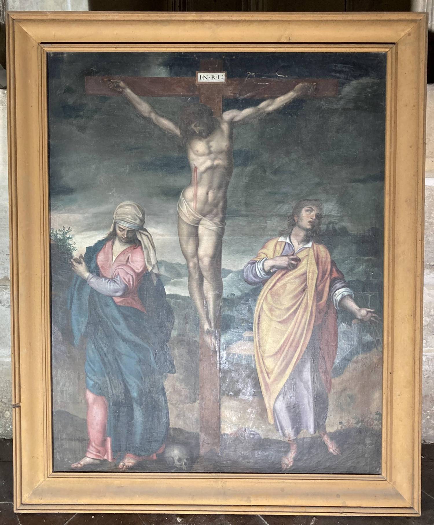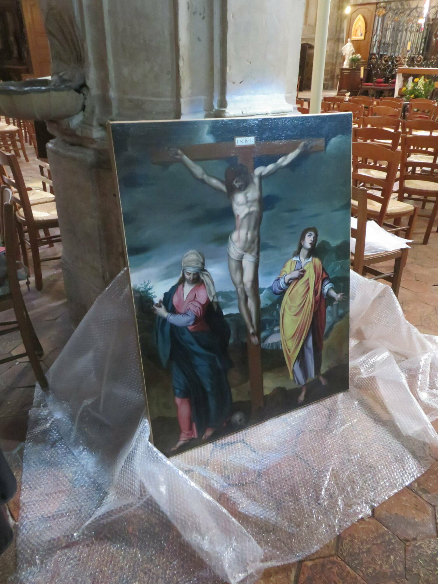 Preuve de l’intérêt patrimonial porté à ce tableau, le Christ en Croix a fait l’objet, par le passé, d’une campagne de restauration. Cette dernière a opéré un rentoilage, opération consistant à coller une toile neuve à l’arrière de la toile usée. Malheureusement, ce dispositif avait vieilli et n’assurait plus son rôle de maintien de la couche picturale, voire en aggravait le sort en créant des soulèvements de la couche picturale. L’œuvre accusait donc une grande fragilité qui menaçait très directement sa pérennité. Une restauration fondamentale était devenue nécessaire à sa bonne conservation.