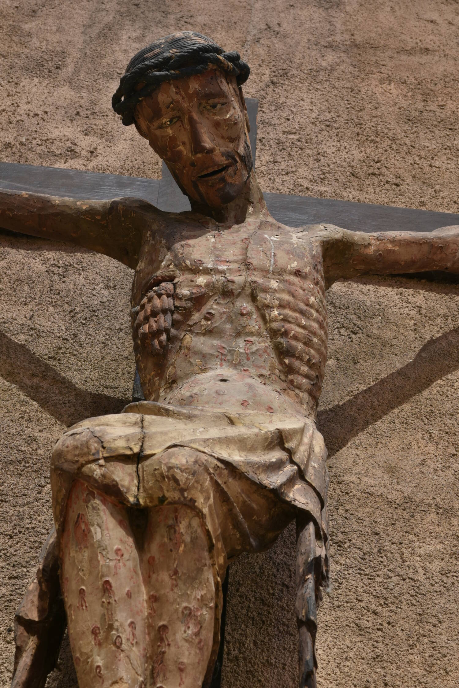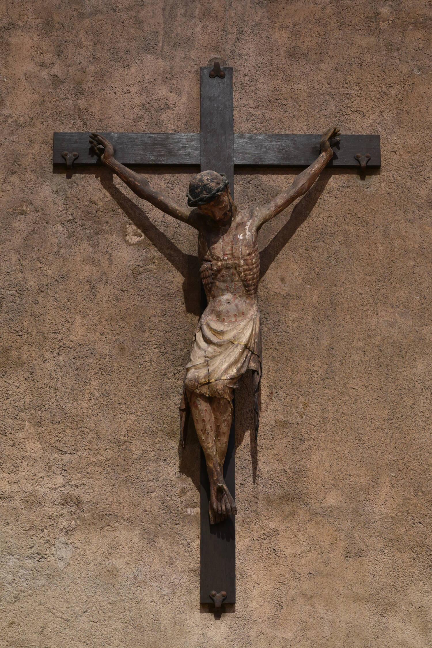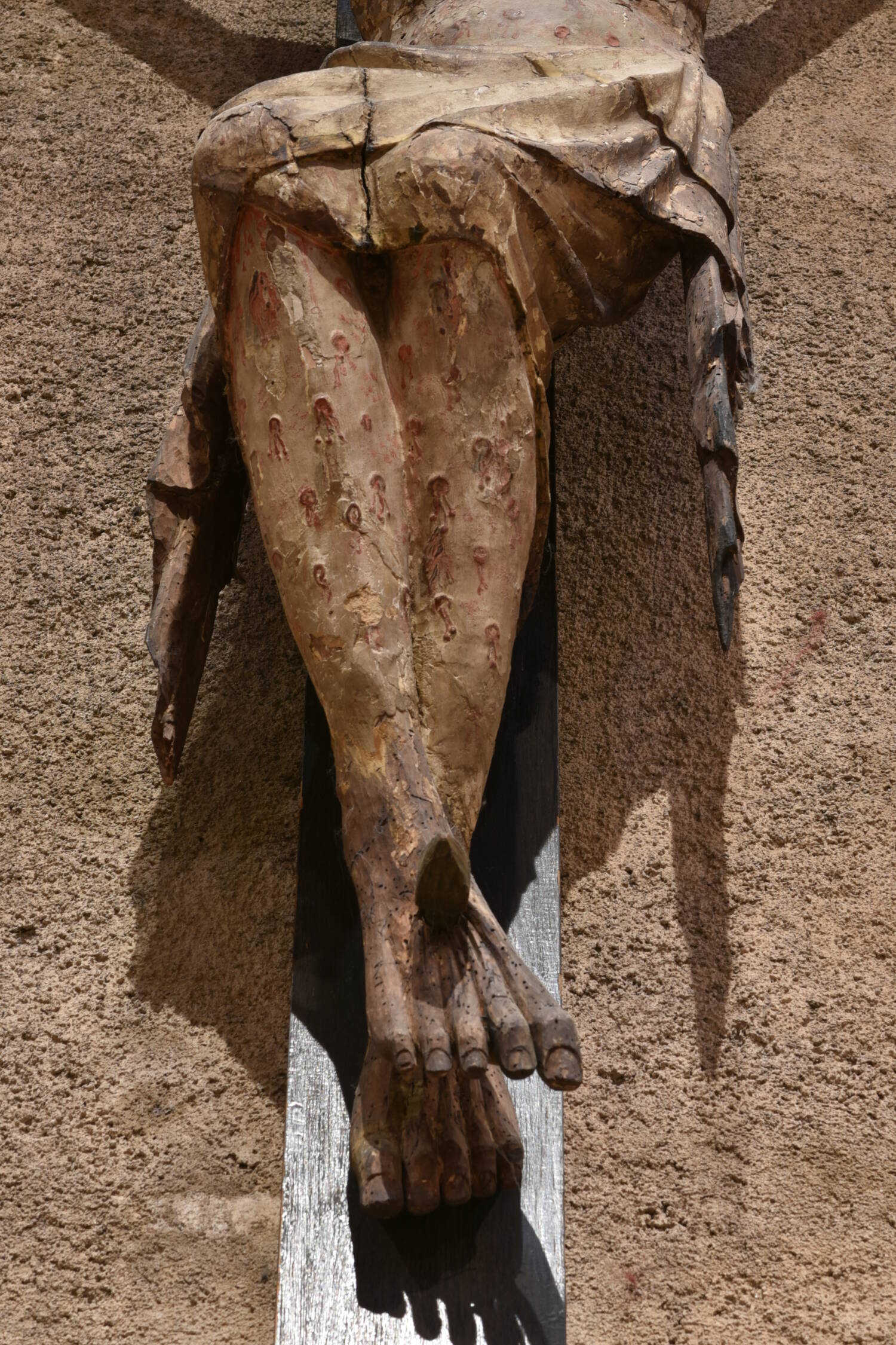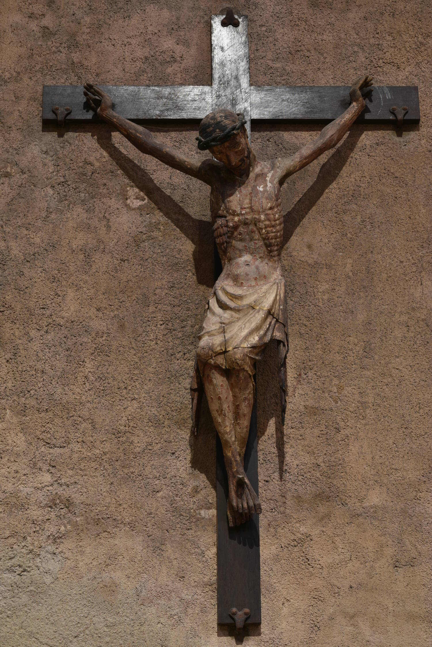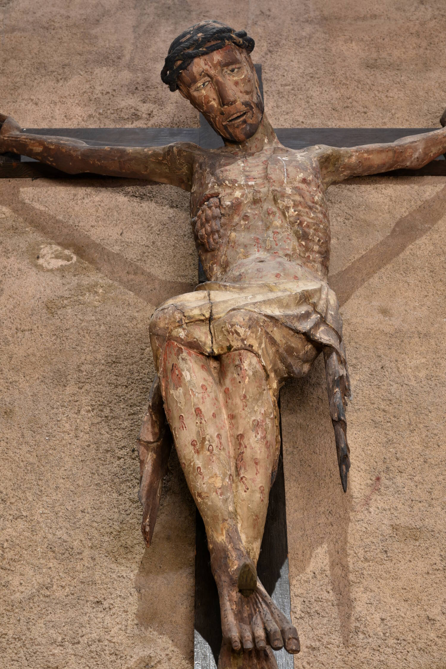 Le « Christ en croix » est une sculpture en bois peint datant du XVᵉ siècle. Haut de 2,10 mètres, ce Christ, surnommé « Christ lépreux » en raison de ses traits décharnés et de sa peau marquée de pustules, se distingue par son expressivité poignante mettant en scène la souffrance du Christ à travers des détails dramatiques : le visage émacié, les muscles, les tendons et les os visibles sous la peau, ainsi que la blessure du torse révélant les côtes.