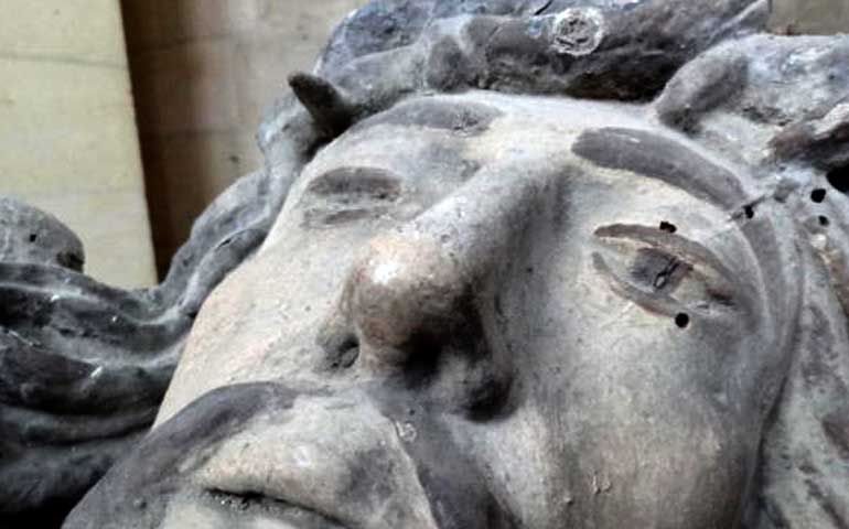 La cathédrale Notre-Dame de Noyon, premier édifice religieux gothique du nord de la France, dissimule derrière son austère façade un ensemble mobilier diversifié de grande qualité. Ce Christ sans croix grandeur nature, déposé dans le cloître, était menacé par l’humidité ambiante incompatible avec la conservation du bois.